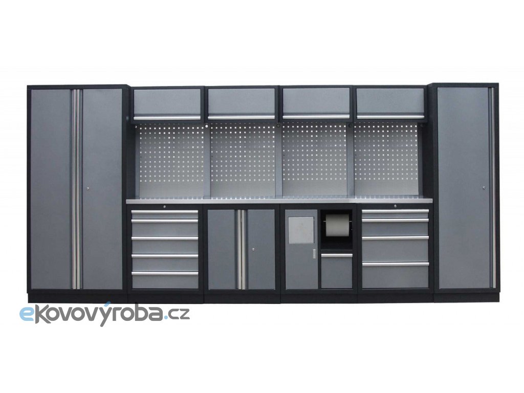 Dílenský nábytek PROFI GREY s nerezovou deskou zaujme moderním a profesionálním vzhledem. Kombinace kladívkové šedé a černé RAL 9004 barvy se bude vyjímat v každé garáži i dílně.