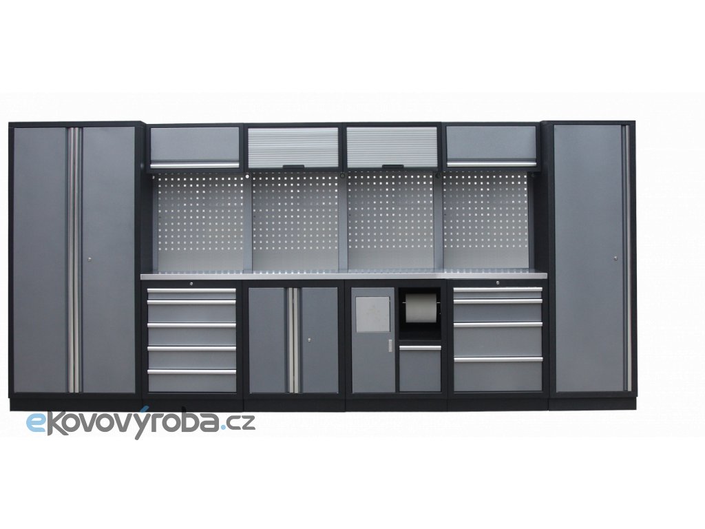 Jednotlivé komponenty jsou plně konfigurovatelné, sestavu je možné dle vašich potřeb rozšířit o další skříně, regály i ponk.
