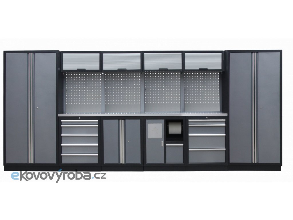Dílenský nábytek PROFI GREY s nerezovou deskou zaujme moderním a profesionálním vzhledem. Kombinace kladívkové šedé a černé RAL 9004 barvy se bude vyjímat v každé garáži i dílně.