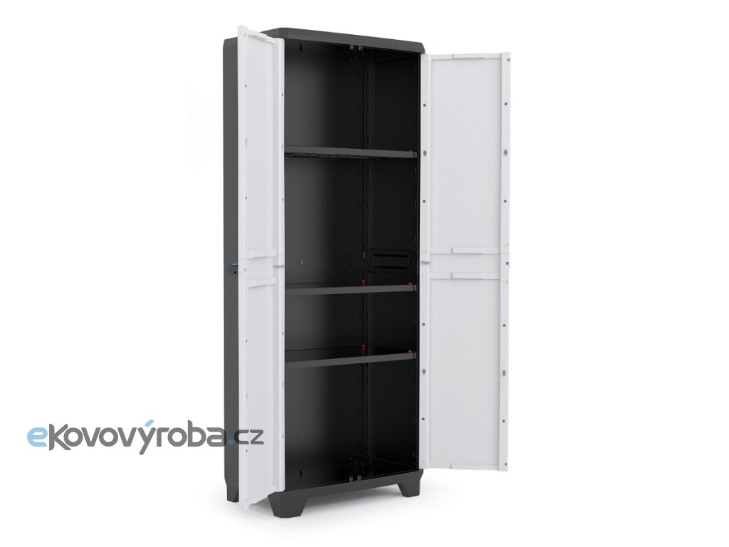 Odolná skříň vhodná do garáže, na chatu, na terasu nebo do sklepa. Pevné panty, možnost uzamčení a odolnost skříně jsou výhodou. Snadná údržba. Tři nastavitelné police s nosností 15 kg. - vysoká skříň- tři nastavitelné police- nosnost polic 15 kg- velká odolnost