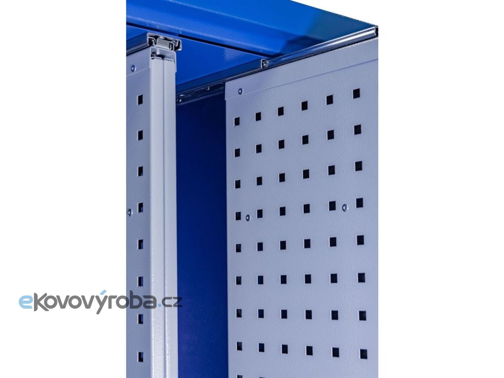 Vybavení: dvoudveřová skříň (-> uzamykání cylindrickým/rozvorovým zámkem - dvojité uzamčení, 2 klíče); čtyři závěsné panely s oboustranným děrováním (-> čtverhranné otvory 10 mm2, síť 38 x 38 mm); čtyři vyjímatelné police (-> volitelné nastavení výšky).