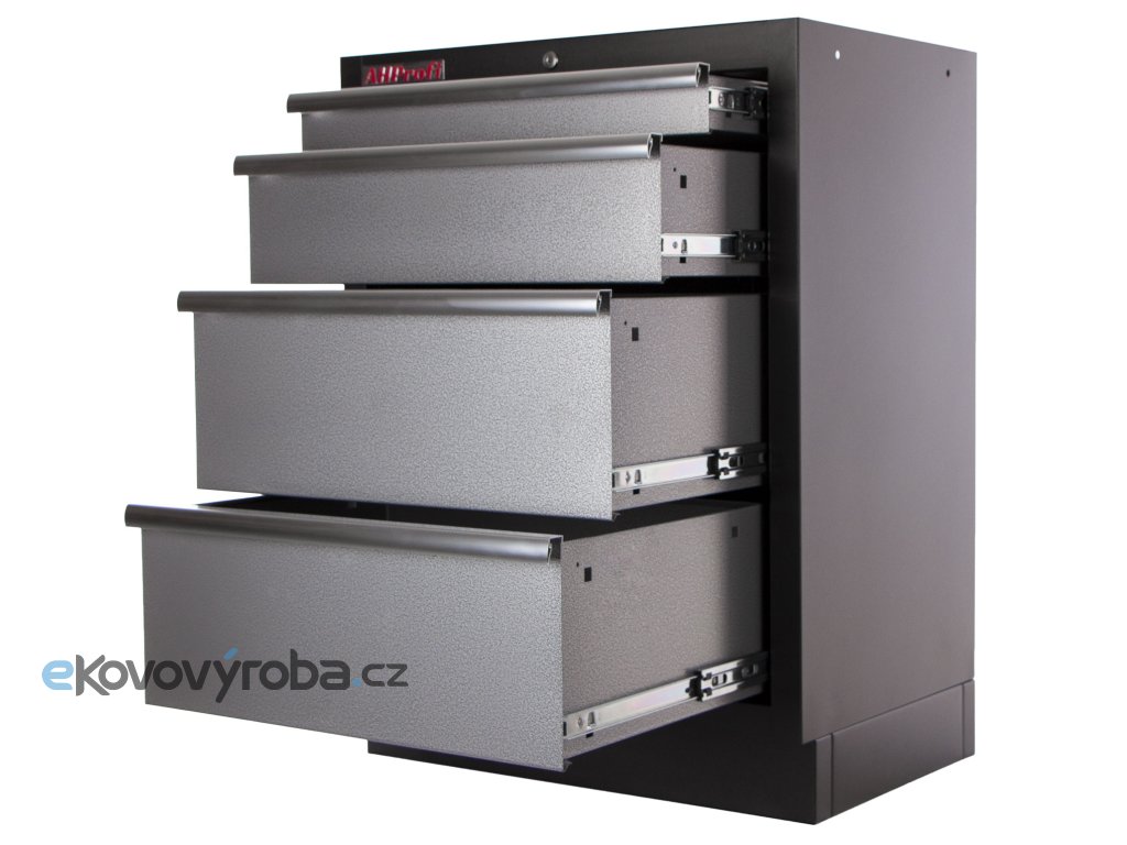 Nízké skříňky vyplňují prostor pod pracovní deskou. Do zásuvek můžeme vložit výplně s nářadím, nebo prázdné, do kterých si vložíte své nářadí. Také nabízíme organizéry na šroubky, které se skvěle hodí na pracovní desku. Výsuvy zásuvek jsou osazeny kuličkovými ložisky.