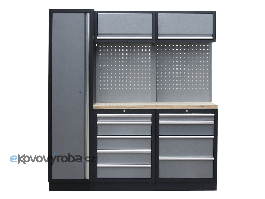 Sestava nábytku v sobě skrývá dostatečné množství úložného prostoru pro vaše nářadí, autotechniku i dílenské vybavení. V kombinaci s bytelnou pracovní deskou získáte multifunkční stěnu, se kterou vám půjde práce od ruky ve všech směrech.