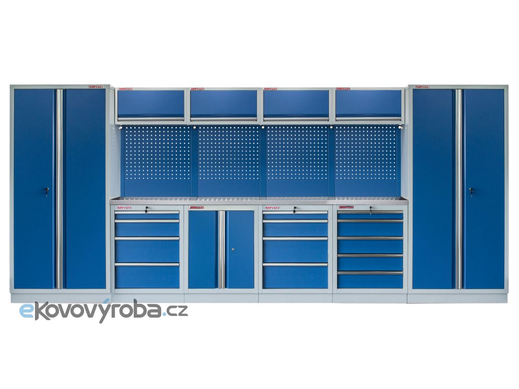 Sestava dílenského nábytku ve vysoké kvalitě, který je vhodný pro profesionální servisy i domácí garáže a dílny. Nábytek je celokovový s kovovou pracovní deskou. Sestava 21 ks dílenského nábytku udrží nářadí přehledně uklizené na správném místě.
