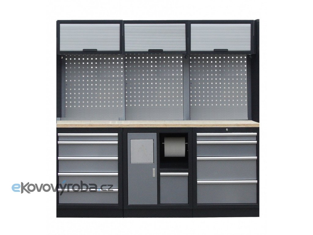 Dílenský nábytek PROFI GREY s dřevěnou deskou zaujme moderním a profesionálním vzhledem. Kombinace kladívkové šedé a černé RAL 9004 se bude vyjímat v každé garáži i dílně.