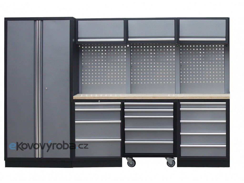 Sestava dílenského nábytku ve vysoké kvalitě, který je vhodný pro profesionální servisy i domácí garáže a dílny. Nábytek je celokovový s dřevěnou pracovní deskou. Sestava 7 ks dílenského nábytku udrží nářadí přehledně uklizené na správném místě.