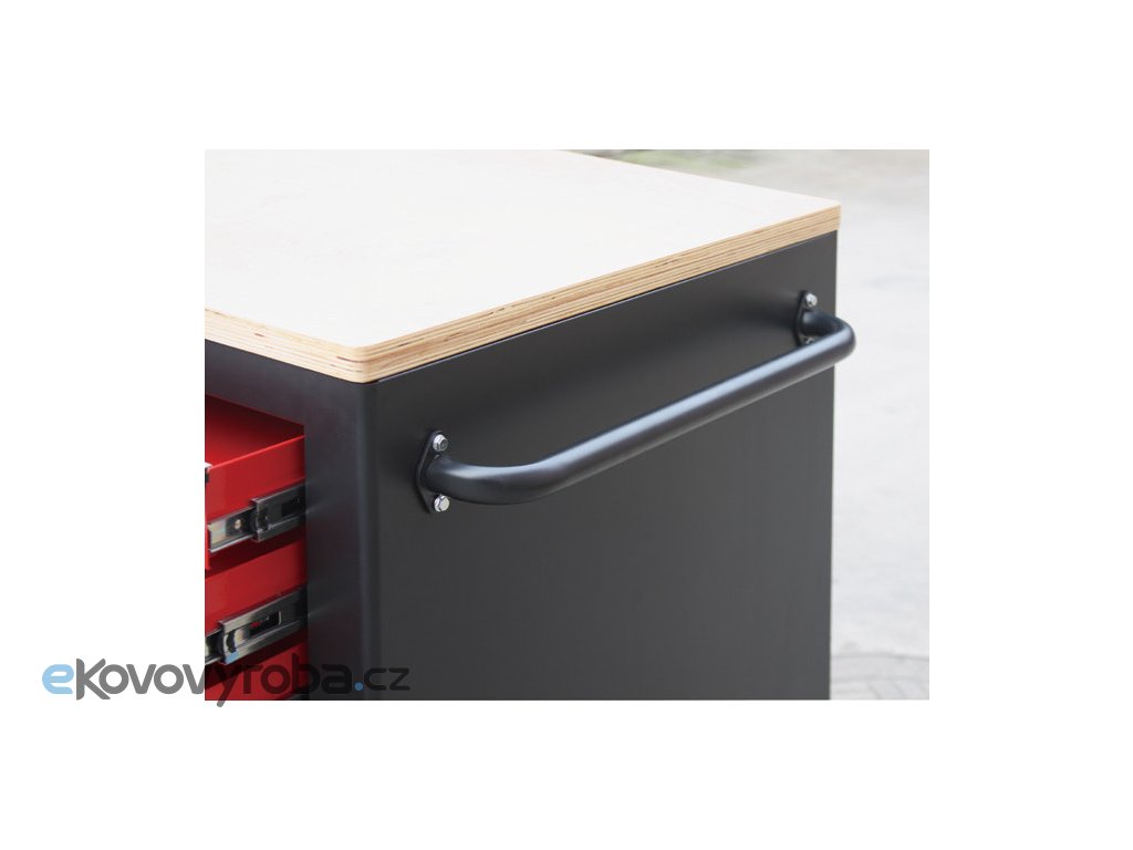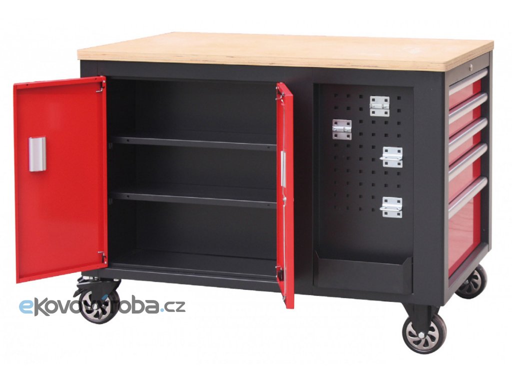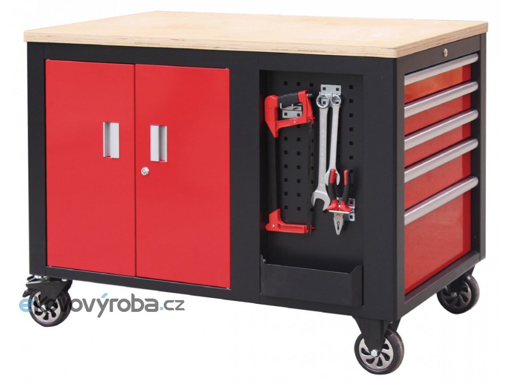 Na širších stranách vozíků jsou 2x děrované desky s přihrádkou, z jedné strany 5 zásuvek a z druhé dvoukřídlá skříňka se 2-mi poličkami. Na užších stranách se nachází dalších 5 zásuvek a madlo pro snadné manipulování s dílenských vozíkem.