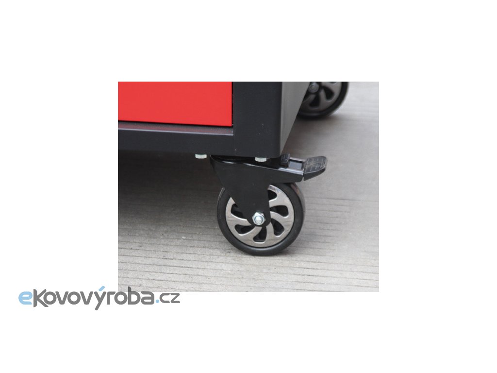 Černo-červený velký dílenský vozík s 10-ti zásuvkami o rozměrech (š x h x v): 1141 x 730 x 888 mm. Vozík je zamykatelný, má 2 pevná a 2 otočná pogumovaná kolečka a je doslova všestranný. Uskladňovací prostory má ze všech stran!