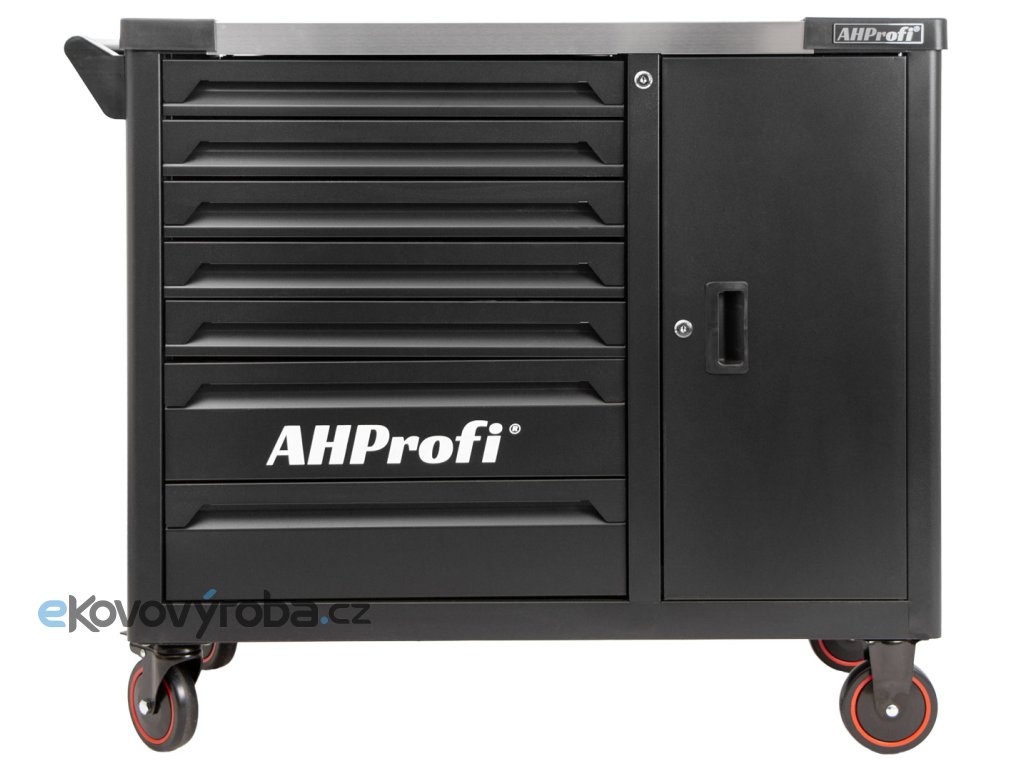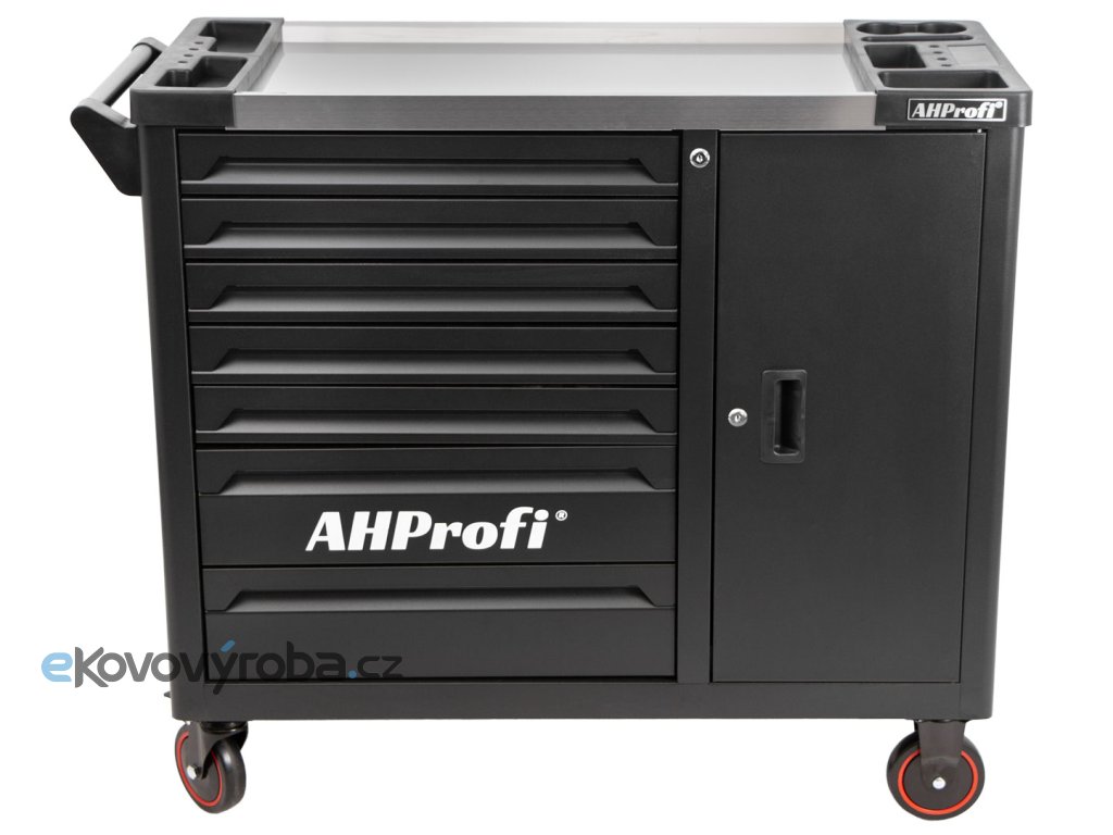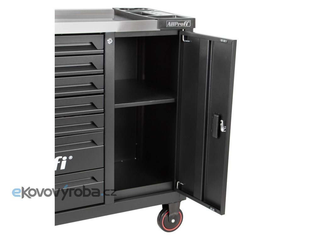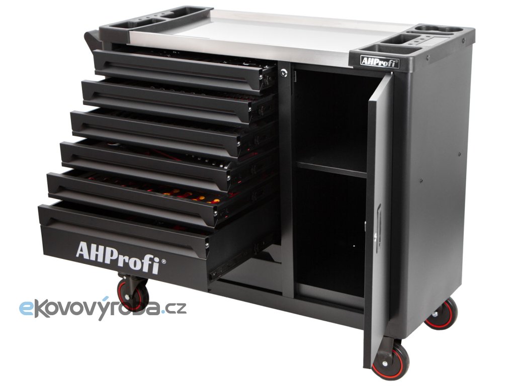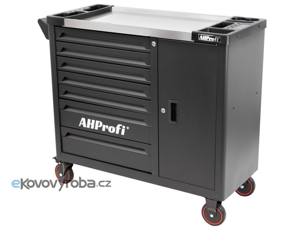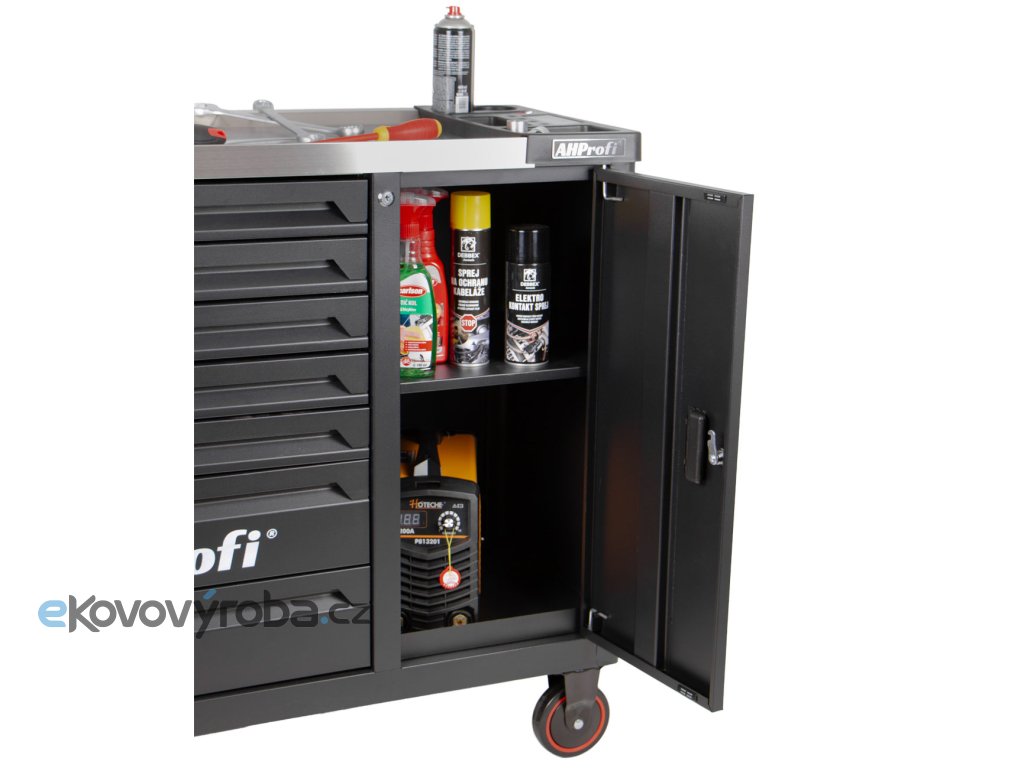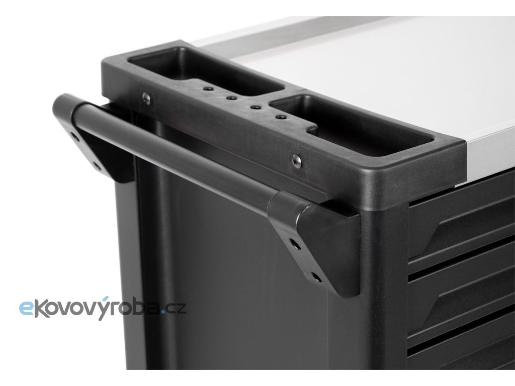 Široká konstrukce vozíku s množstvím úložného prostoru s celkem 7 zásuvkami a skříňkou, umožnuje dokonalý přehled nad nářadím.
