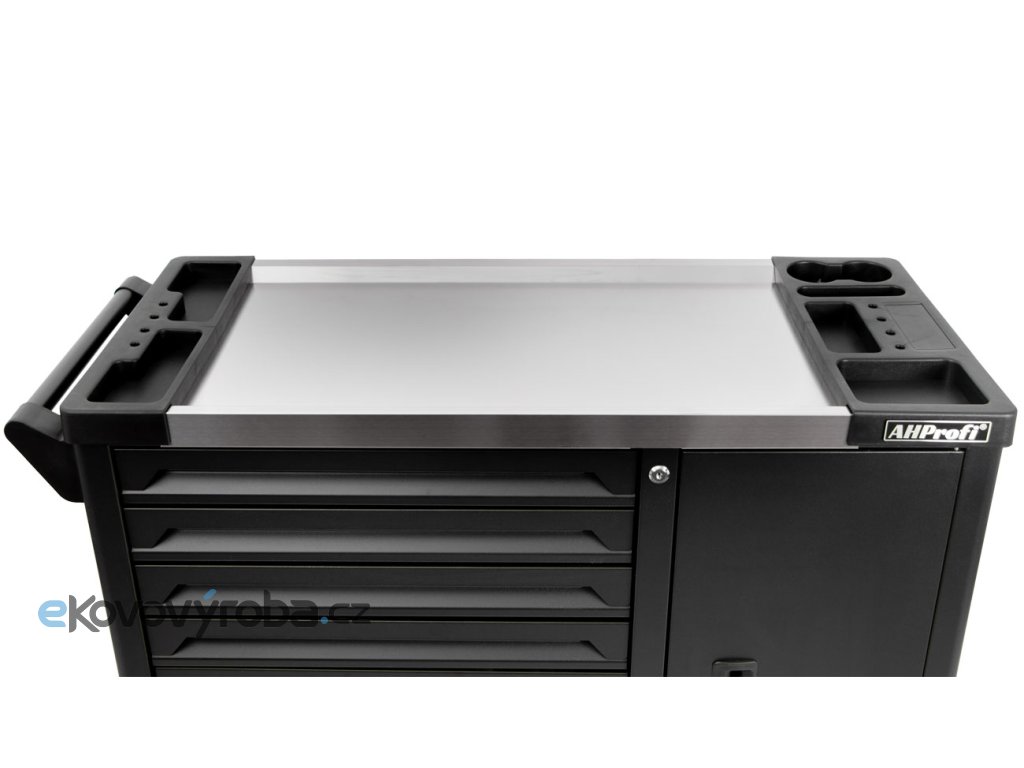 Dílenský vozík je vybaven nerezovou pracovní deskou, která je odolná vůči opotřebení a snadno se čistí. Praktické plastové úložníky na obou stranách pracovní desky poskytují prostor pro uložení často používaného drobného příslušenství.