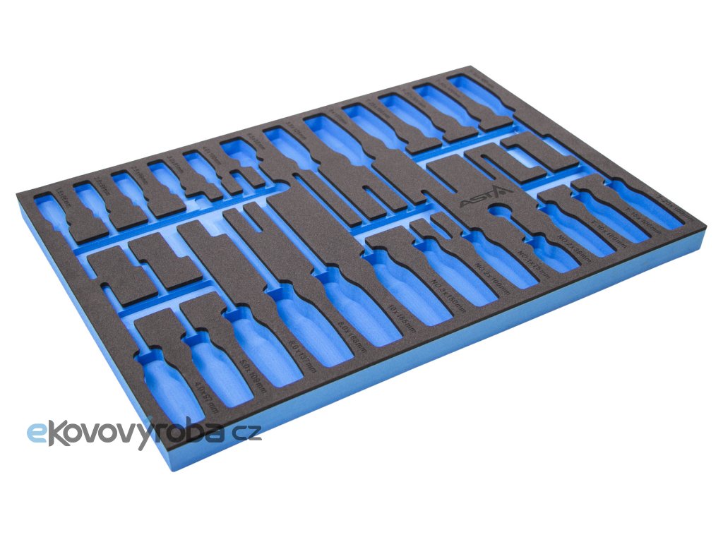 Prázdná pěnová vložka pro šroubováky. Vložka najde využití při organizaci vašeho nářadí v dílenských vozících nebo pracovních stolech.
