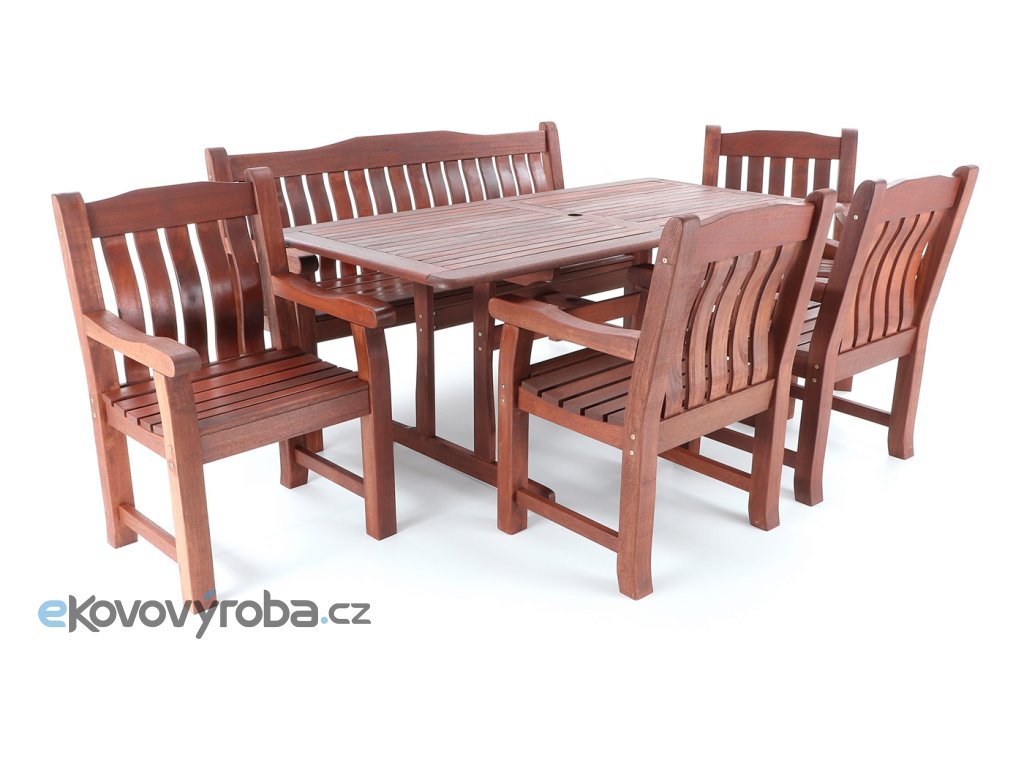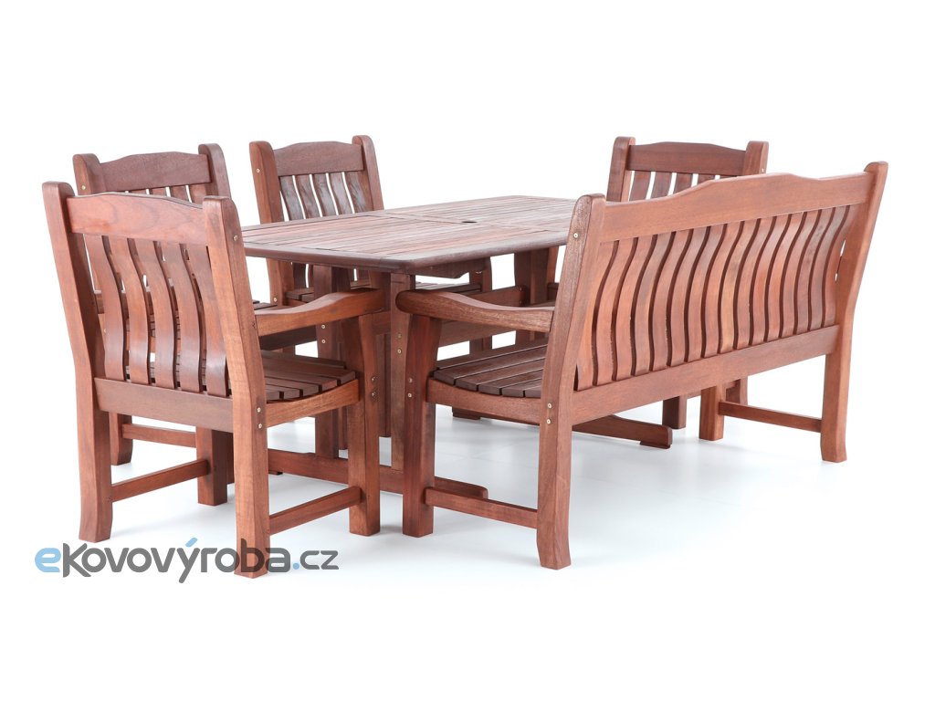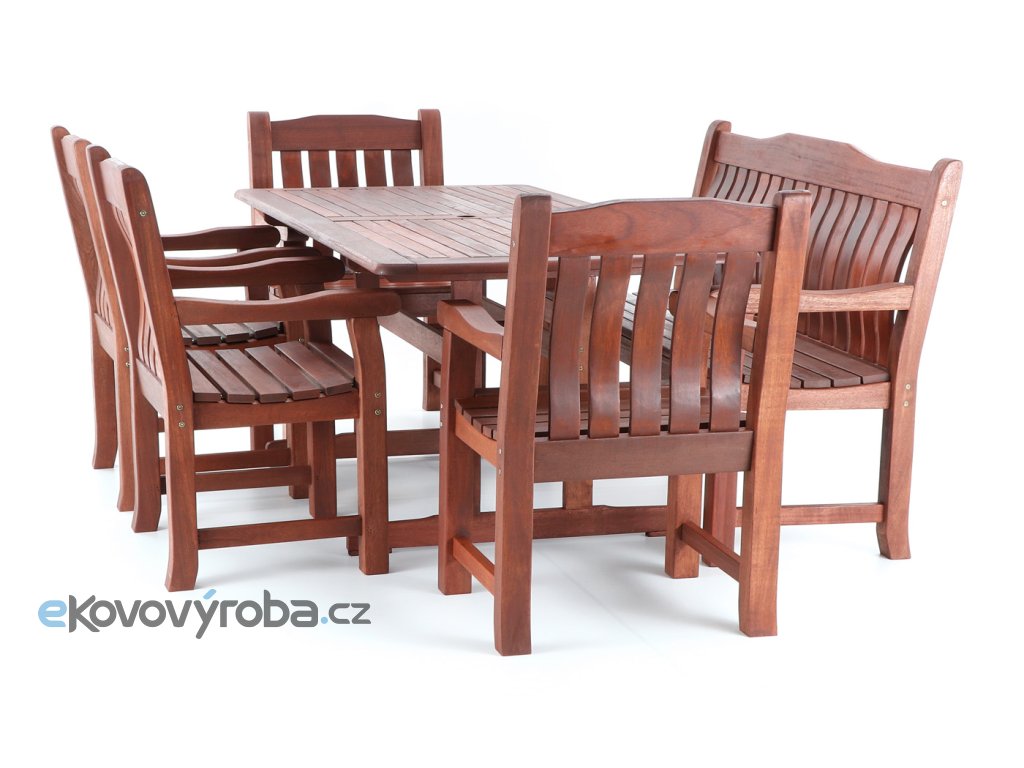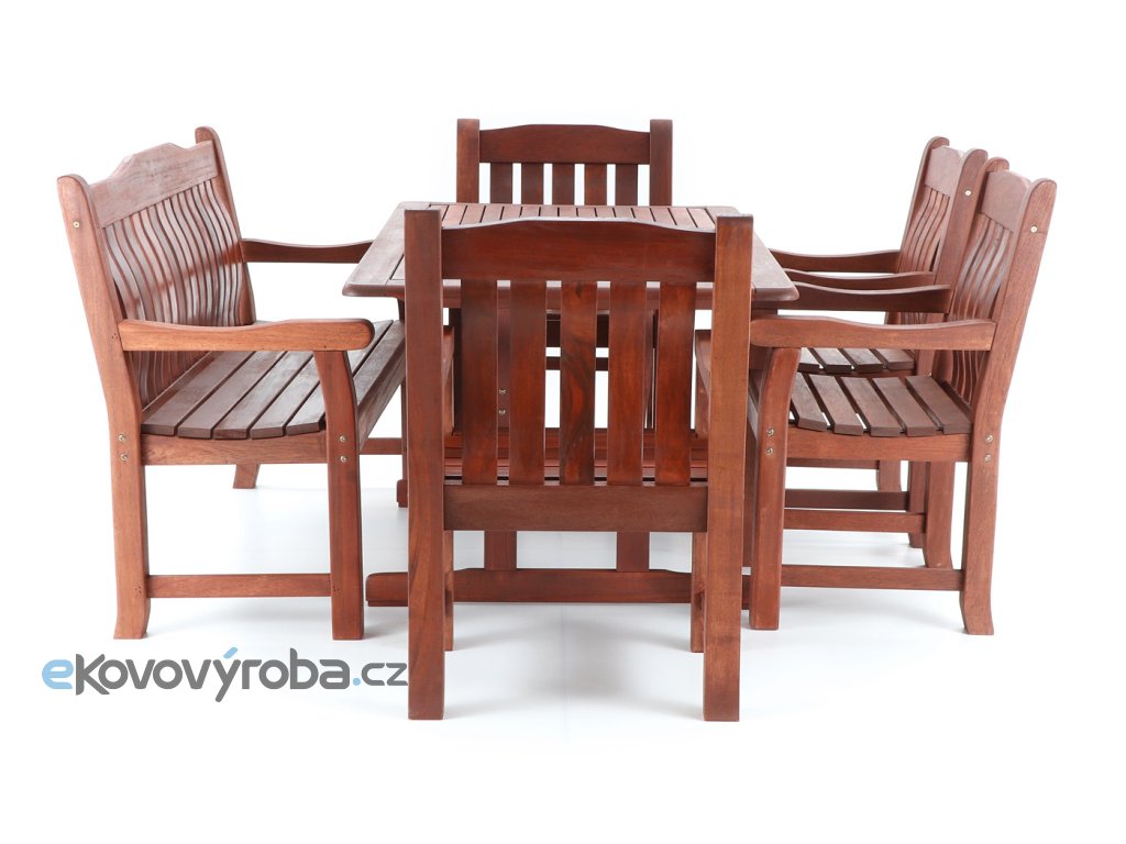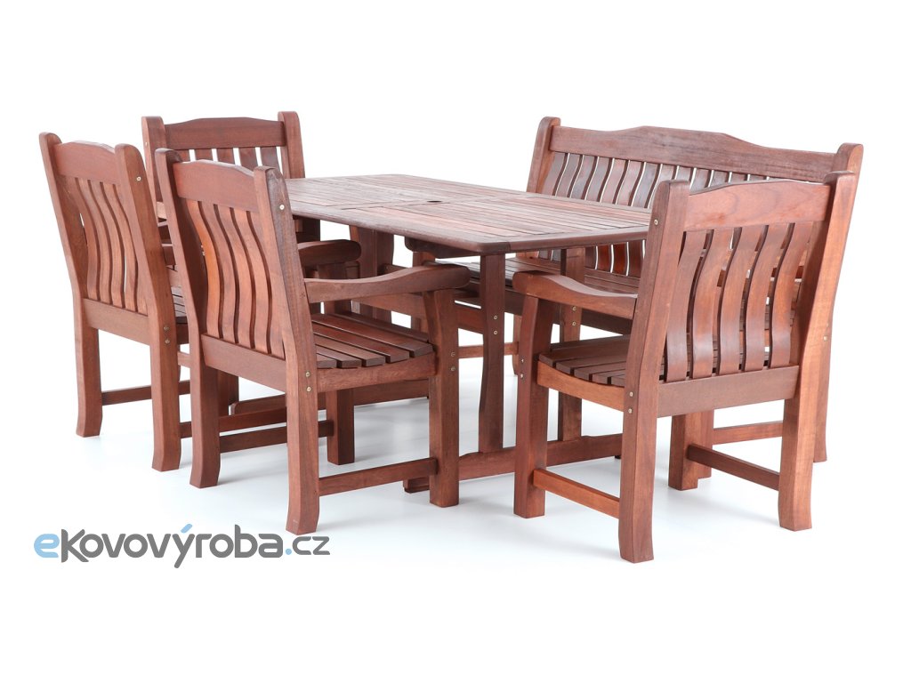 Luxusní masivní stolová sestava čtyř křesel, jedné lavice a stolu z exotického, velice trvanlivého a tvrdého dřeva MERANTI. Dřevo o neuvěřitelné síle a velmi robustní konstrukce řadí tuto sestavu mezi nejmasivnějších výrobky ve své kategorii na trhu.