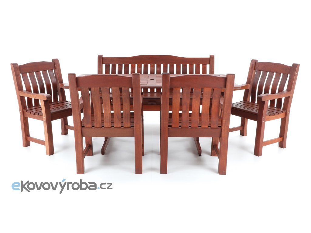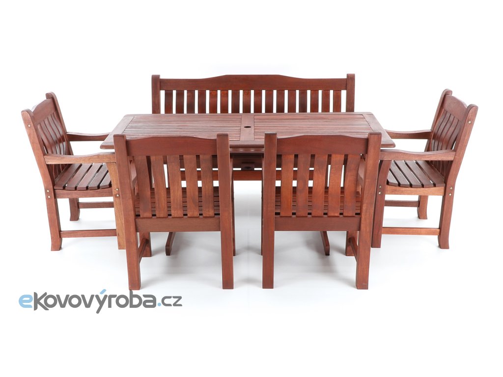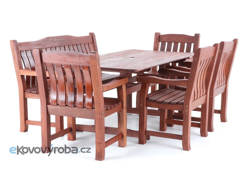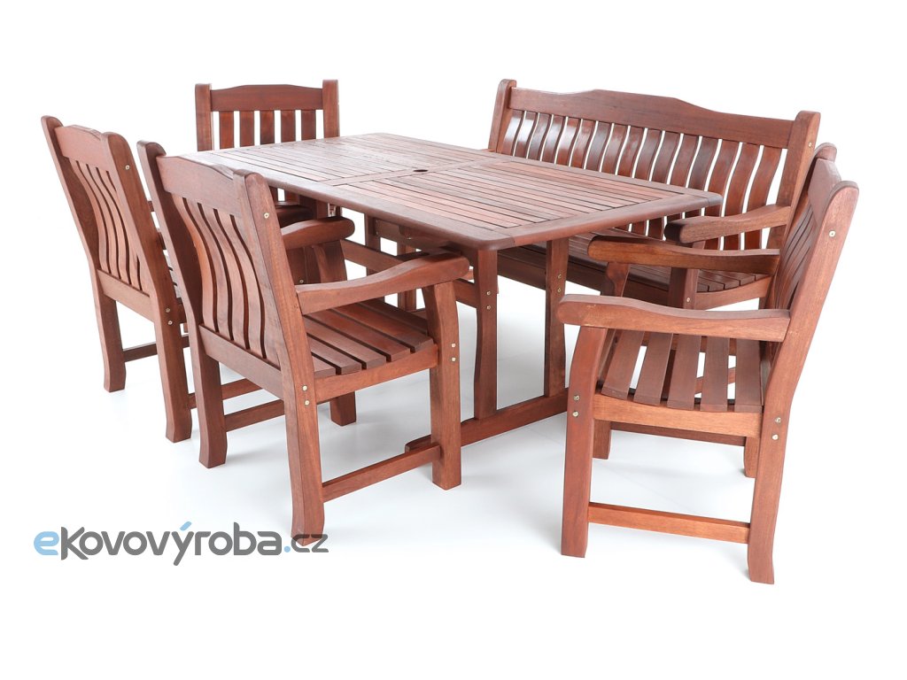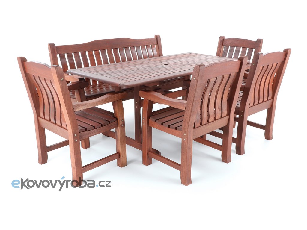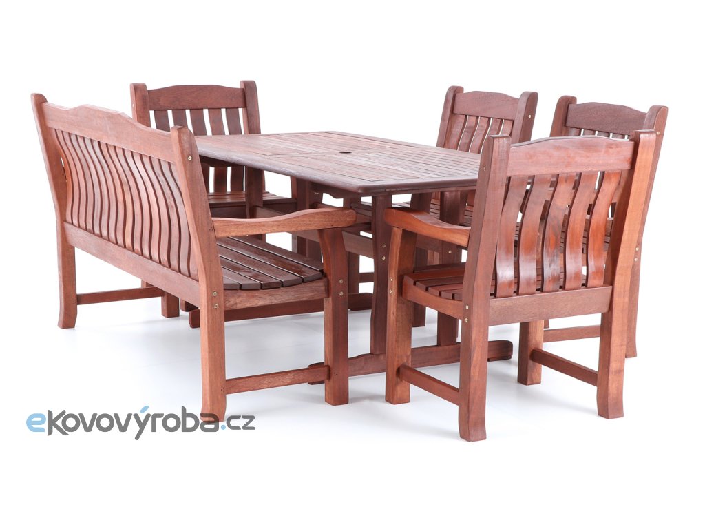 Luxusní masivní stolová sestava čtyř křesel, jedné lavice a stolu z exotického, velice trvanlivého a tvrdého dřeva MERANTI. Dřevo o neuvěřitelné síle a velmi robustní konstrukce řadí tuto sestavu mezi nejmasivnějších výrobky ve své kategorii na trhu.