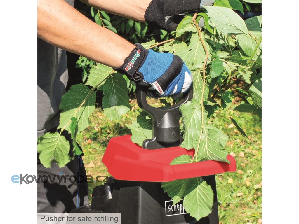 Scheppach GS 60 je praktický pomocník pro drcení zahradního odpadu, jako jsou větve prořezaných stromů nebo živých plotů, náletové dřeviny a podobný dřevní odpad. Zpracovává odpad na pravidelné štěpky, které lze využít pro účely kompostování, jako mulč nebo i jako palivo. K drtiči je standardně dodávaný integrovaný plastový sběrný box, do kterého lze štěpky zachytávat. Box je z průsvitného materiálu, takže lze snadno pohledem kontrolovat jeho naplnění. Základem výkonného drtícího ústrojí je pomaloběžný drtící válec, který je pro delší životnost uložen v pevném kovovém bloku. Ozubený válec si sám vtahuje větve do vnitřku ústrojí, což je velmi pohodlné. Díky nízkým otáčkám je stroj velmi tichý. Drtič je vybaven silným motorem 2800 W chráněným proti přetížení kvalitní elektronikou a motorovou brzdou. Má i zpětný chod pro snazší uvolnění vzpříčených větví. Stroj je dále vybaven pojezdovými koly a madlem pro snadný transport a tyčí na posunování větví. Součástí setu jsou i pracovní rukavice a zahradní nůžky.