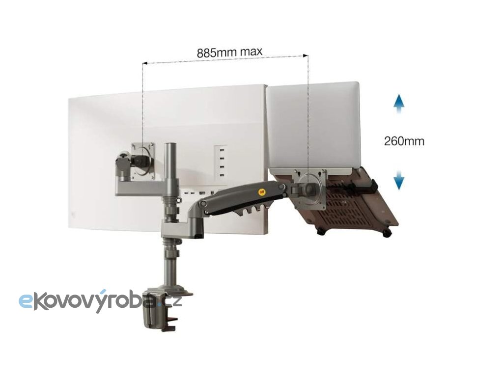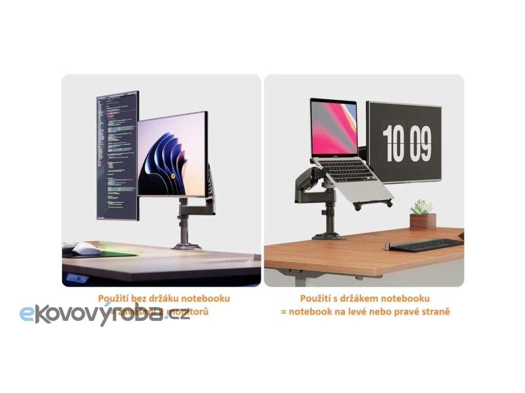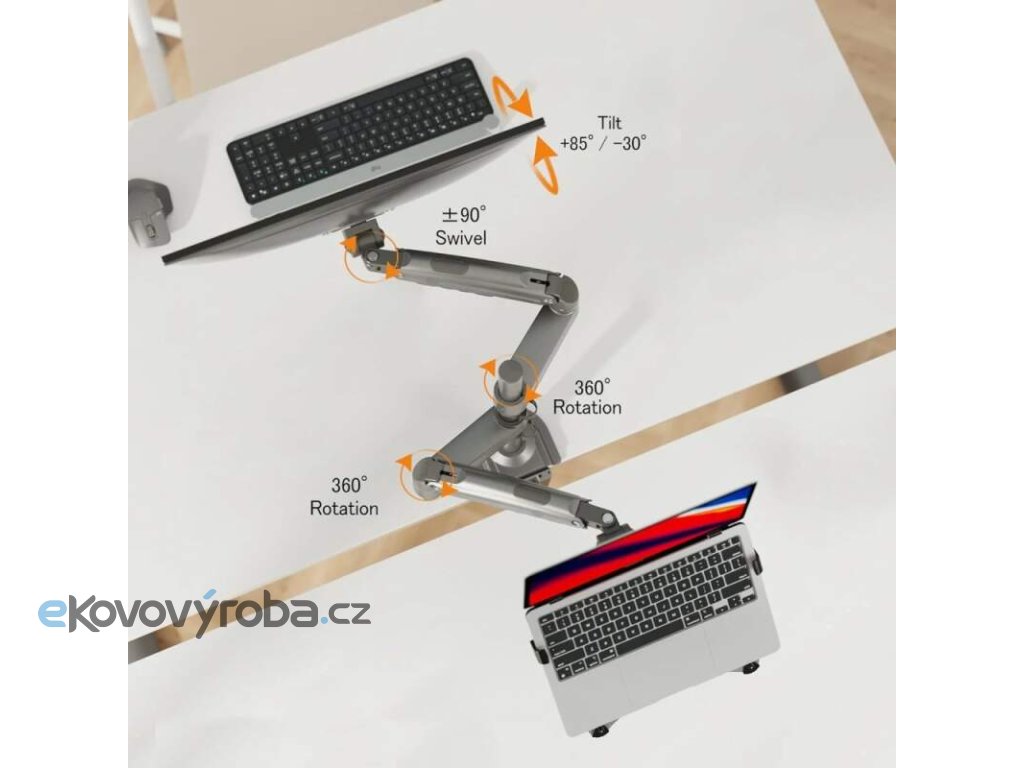 Kvalitní plně polohovatelný stolní držák na monitor 17" - 35" + držák na notebook 10,1" - 17", otáčení do stran +180° / -180°, naklápění +85° / -30°, vzdálenost od úchytu max. 550 mm, duální výškové nastavení max. 615 mm, 2 stolové úchyty, nosnost 24kg (2x12 kg)
