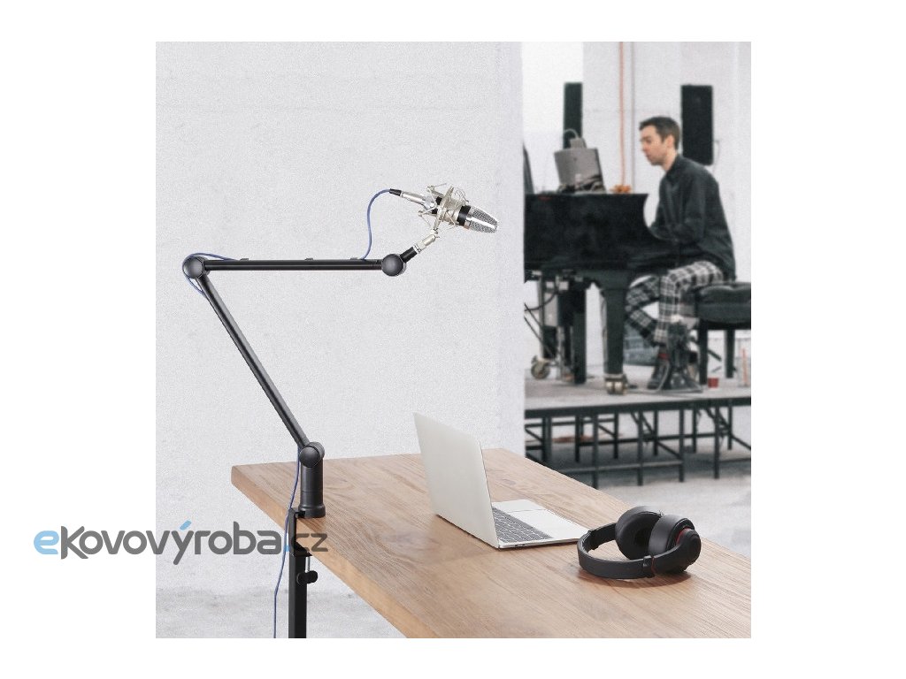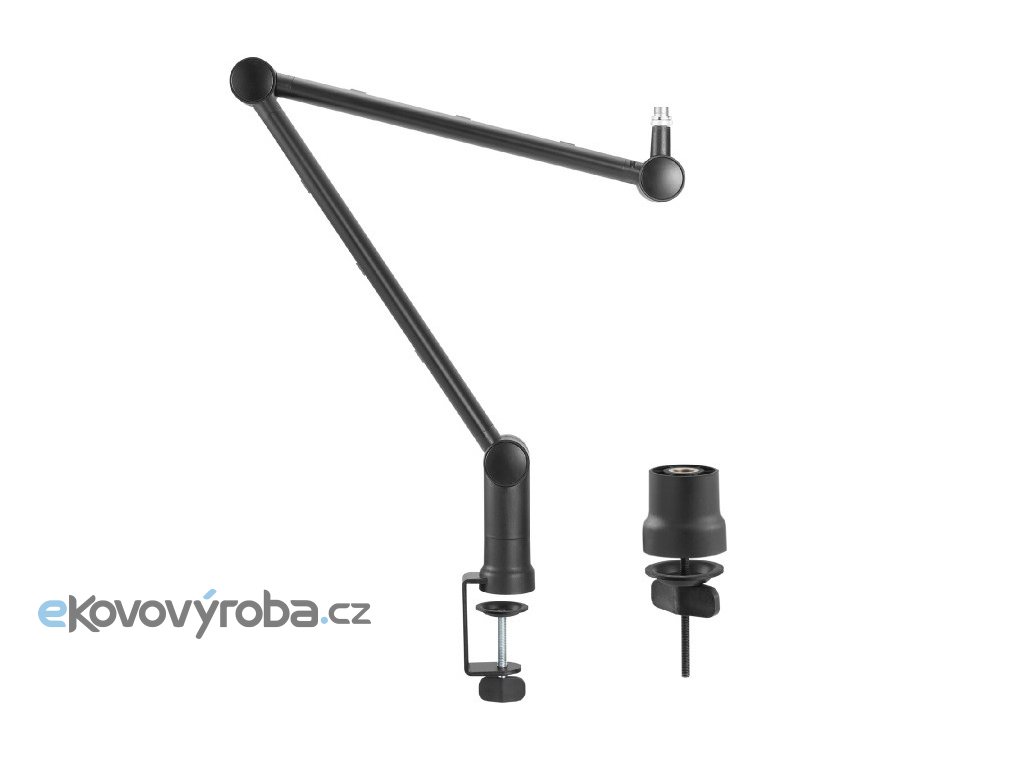 Mikrofonové rameno / držák je vhodný pro většinu studiových a počítačových mikrofonů, které lze namontovat na standardní 3/8" nebo 5/8" závit. Je tvořen odolnou hliníkovou konstrukcí a vybaven vnitřními pružinami a praktickým vedením kabelů. Stane se skvělým pomocníkem v živém vysílání, při klasickém nahrávání hlasu nebo hraní her. Rameno lze upnout na pracovní plochu nebo trvale připevnit na místo.