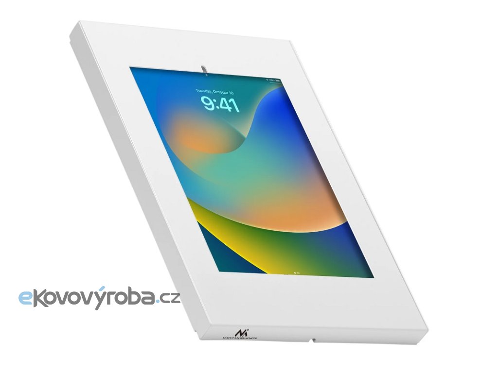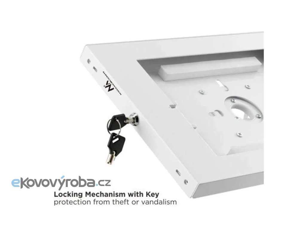 Kvalitní bezpečnostní držák na tablety 9,7" až 11" s uzamčením. Navrženo pro instalaci na zeď nebo na ramena držáků s VESA 75x75. Instalace na výšku nebo na šířku, tlačítko HOME, protiskluzové podložky uvnitř pouzdra, bílé provedení