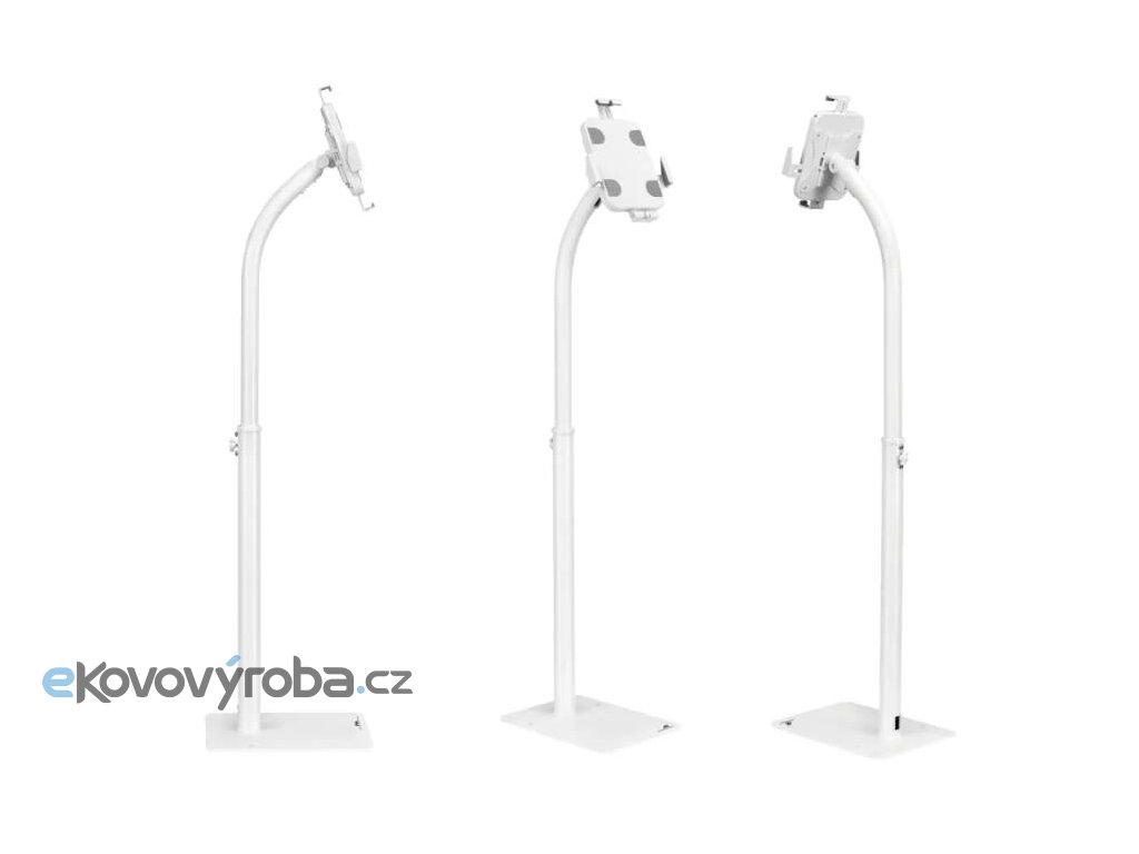 Podlahový stojan na tablet iPad 7,9" - 11", nastavení výšky 790 - 1190mm, náklon +20° / -110°, pivot rotace +180° / -180°, rozměry tabletu 129 - 181mm x 200 - 246mm, síla max. 9mm, zajištění tabletu v držáku pomocí imbusového klíče, barva bílá
