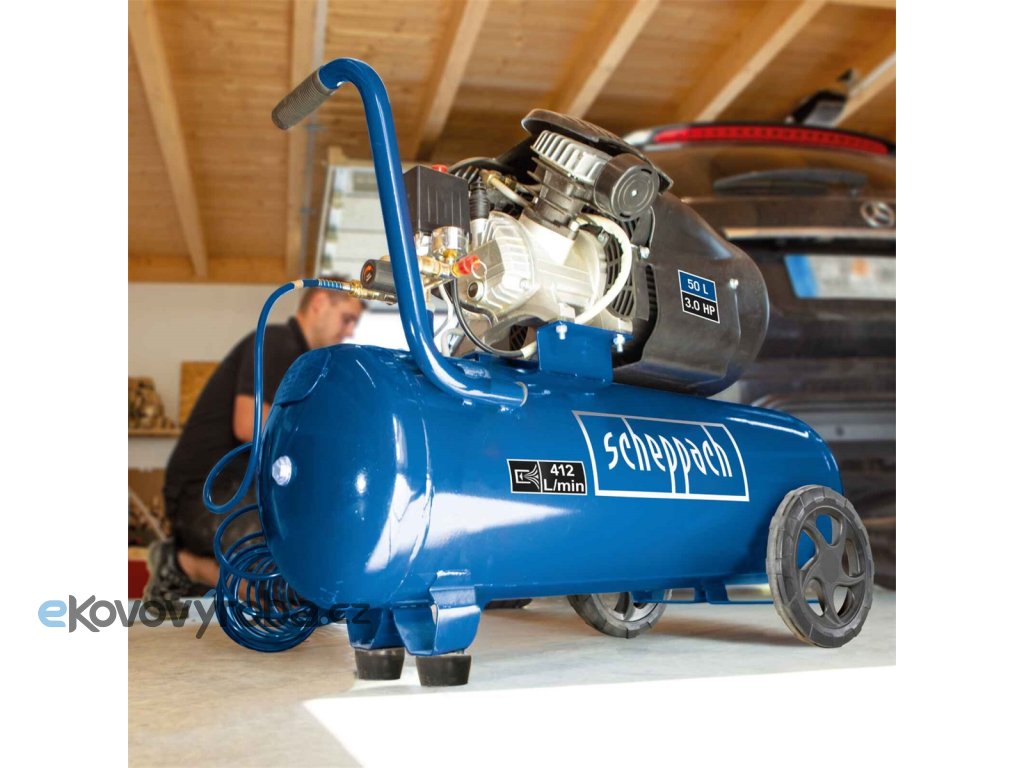 • Tento dvouválcový kompresor je ideálním pomocníkem do dílny každého náročného kutila a díky velkému obsahu vzdušníku najde uplatnění i v mnoha řemeslných dílnách. Pumpa kompresoru je mazána olejem, což prodlužuje životnost celého stroje i při častém používání. Aby byla kontrola oleje jednoduchá, je kompresor vybaven optickým ukazatelem jeho stavu. Vzdušník slouží jako zásobárna stlačeného vzduchu a motor se tak zapíná jen v případě, že tlak vzduchu klesne pod požadovanou úroveň. Opětovné natlakování 50ti litrové nádrže má na starosti silný dvouválcový motor o vysokém maximálním výkonu 3 HP. Díky velkému objemu vzdušníku můžete s kompresorem mimo běžného huštění a ofukování provádět i náročnější operace s použitím různých druhů pneumatického nářadí a je vhodný i pro připojení mycí pistole, stříkací pistole, pískovací trysky ap. Při dofukování pneumatik zase oceníte jednoduché nastavení výše tlaku, který můžete snadno kontrolovat pomocí přehledného manometru. Přídavná rukojeť a kolečka umožní snadnou manipulaci se strojem.