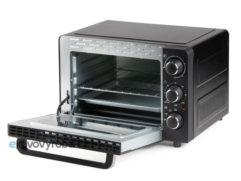 Kompaktní elektrická pečící trouba malých rozměrů vhodná všude tam, kde není místo na klasickou troubu, nebo je potřeba troubu častěji přenášet. Díky svým rozměrům lze troubu i snadno uschovat. Plech na drobky Vám umožňuje rychlé čištění trouby a s úchopkou z nerezové oceli lehce vytáhnete a zatlačíte rožhavený plech nebo gril, bez toho abyste se popálili.