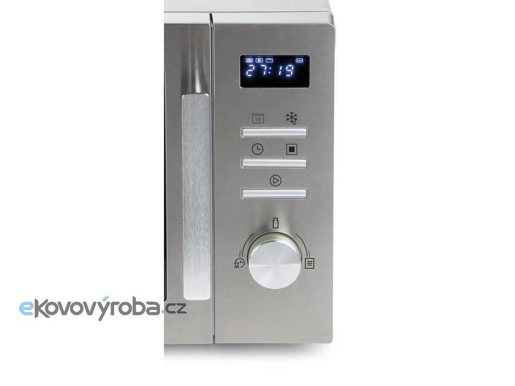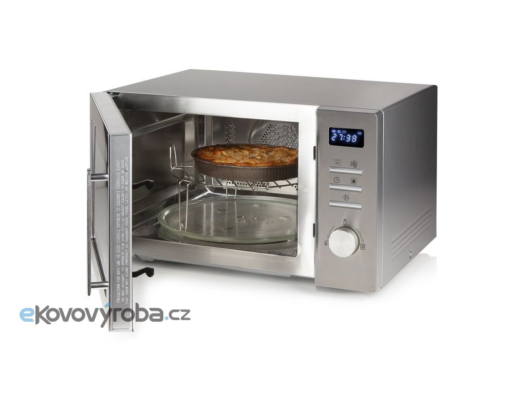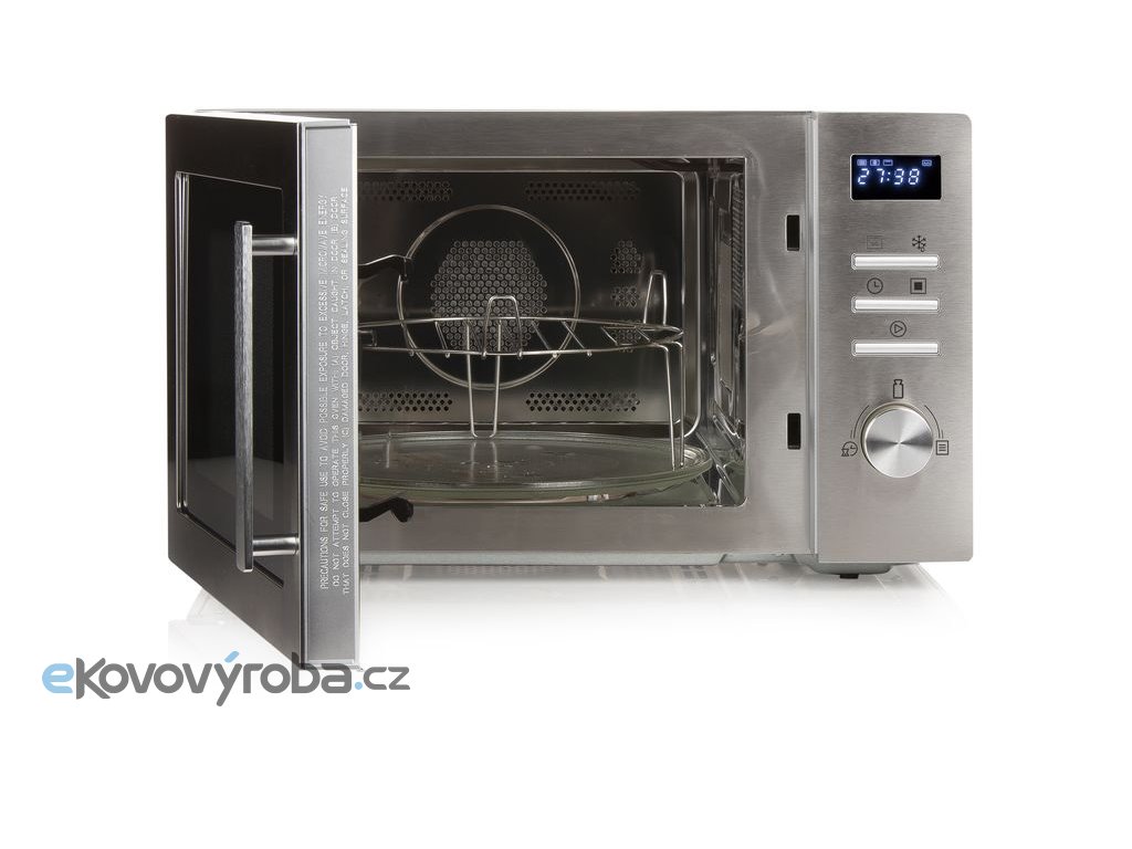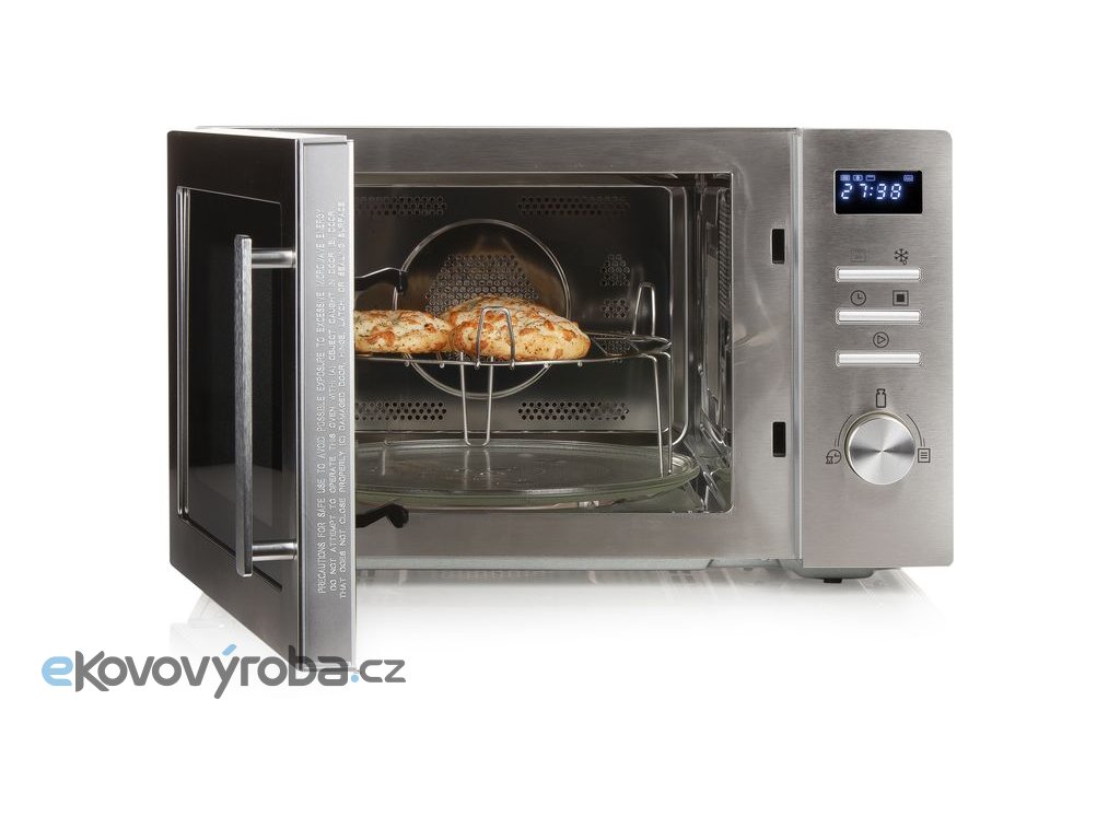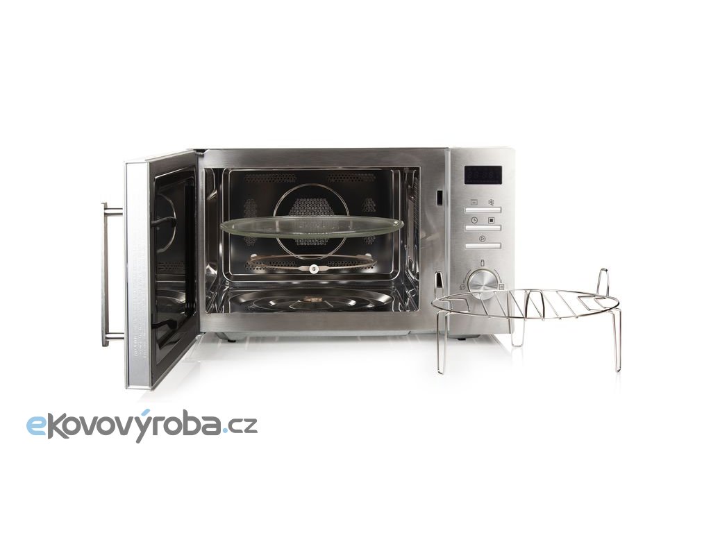 Výkonná mikrovlnná trouba bez jakýchkoliv kompromisů. Na první pohled zaujme vysoce kvalitní broušený nerez čelního panelu s robustním broušeným madlem a velký chromovaný ovladač pro snadné a rychlé nastavení času ohřevu, či teploty horkého vzduchu a všech funkcí. Vnitřní prostor trouby se díky vysoce leštěnému nerezu snadno udržuje čistý. Odkryté topné těleso můžete neustále udržovat snadno v čistotě a bude tak svou funkci plnit bez omezení a přepalování nečistot jako bývá běžné u mikrovlnných trub s krytým topným tělesem.