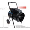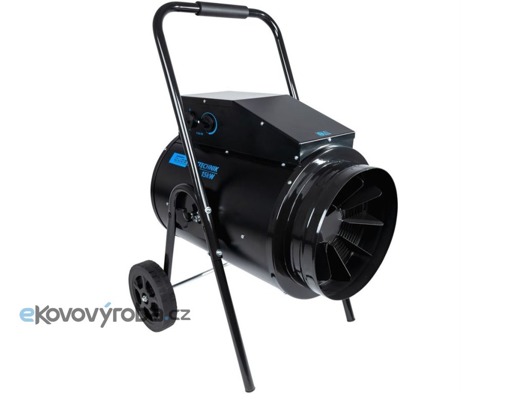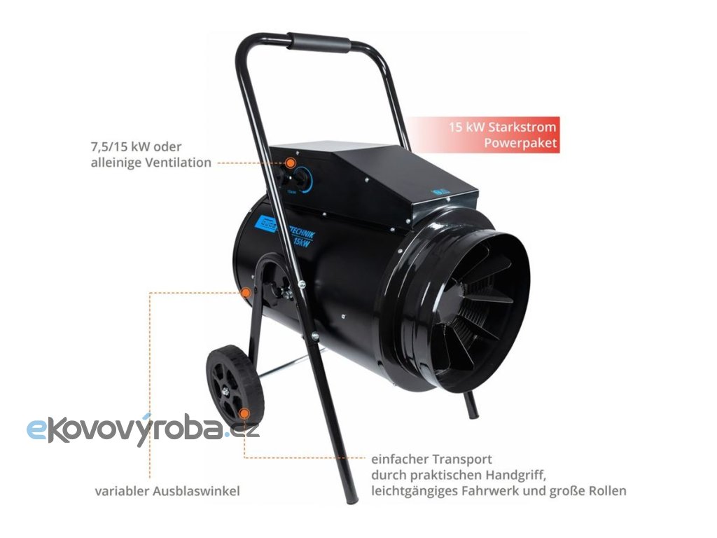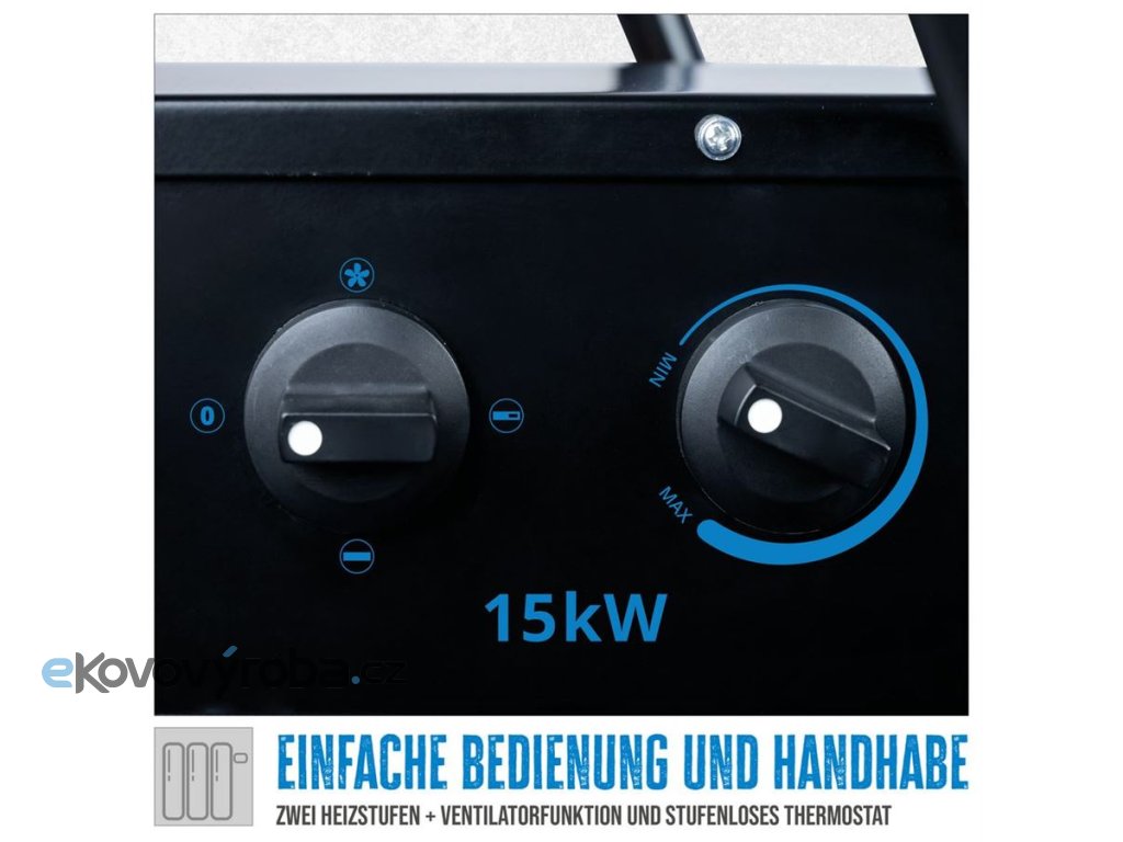 Dva stupně vytápění (7,5 kW - 15 kW) • zahřívání vzduchu bez spotřeby kyslíku nebo zápachu spalin • rychlé rozptýlení horkého vzduchu ventilátorem.
