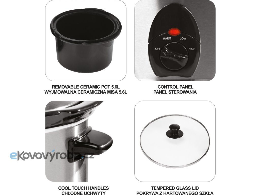 Nepřilnavá keramická mísa pro vaření má objem 5,6l a snadno se čiští. Navíc je opatřena skleněným víkem pro optickou kontrolu pokrmů.