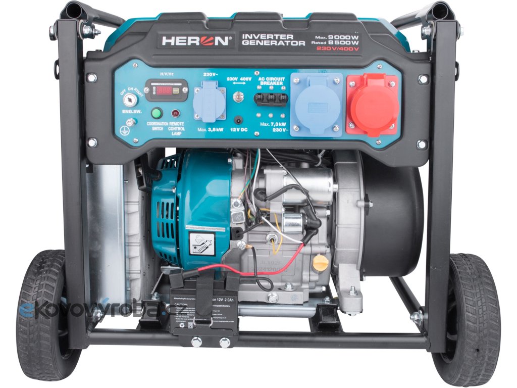 Elektrocentrála je určena jak k používání ve stavebnictví a při montážních pracích, tak jako záložní zdroj elektrické energie pro mobilní servisní střediska a rekreační účely. Dokonalá kvalita napětí, zajištěná invertorovým systémem vyhlazení výstupní křivky, však umožňuje jejich využití také pro napájení citlivé elektroniky, jako je výpočetní technika nebo lékařské vybavení. Díky funkci inteligentní regulace otáček v závislosti na spotřebě je tato digitální elektrocentrála až o 40% ekonomičtější oproti běžným elektrocentrálám. Navíc má možnost zapnout ekonomický režim provozu, kdy se sníží otáčky motoru, výkon, ale i spotřeba, což se hodí pokud nevyužíváte elektrocentrálu na plný výkon. Běžná centrála s AVR regulací, el. startem a výkonem kolem 6,5kW má hmotnost zhruba 100kg. Nám se díky použití nové invertorové technologie podařilo snížit hmotnost o 27% na pouhých 73kg a přitom jsme také zmenšili objem centrály o 27%. A při této miniaturizaci zůstala cena v přepočtu na kW výkonu prakticky stejná jako u starší AVR technologie. Na panelu elektrocentrály je jedna 16A zásuvka, jedna 32A zásuvka s 230V a zásuvkou pro 400V, které umožňují připojit jak běžné spotřebiče, tak připojení spotřebičů s vysokým odběrem (až 9kW/230V a 11,2kVA) jako jsou např. svařovací invertory, stolní pily, velké kompresory... Elektrocentrála je vybavena digitálním počítadlem celkových provozních hodin od prvního startu, provozních hodin od posledního startu, aktuálního napětí a frekvence. Díky elektrickému startu nastartujete a vypnete centrálu stiskem tlačítka jedním prstem. Tento start je zajišťován Li-ion bezúdržbovou baterií s dlouhou životností dobíjenou chodem elektrocentrály. Funkce dálkového ovládání vám umožní nastartovat centrálu při optimálních podmínkách na vzdálenost až 100m. Pokud jsou mezi vámi a centrálou nějaké překážky, je nutné být blíže centrále. Dálkové ovládaní používá RF technologii. Velikost nádrže umožňuje až 7 hodin nepřetržitého provozu (v závislosti na zatížení). Sklopitelné madlo a pevná gumová kola, která jsou součástí dodávky, umožňují snadný převoz elektrocentrály na místo potřeby podobným způsobem jako cestovní zavazadlo s madlem a kolečky. Pro příjemnější práci blízko elektrocentrály jsme ji vybavili novým typem výfuku s nižší hlučností a příjemnějším zvukem.