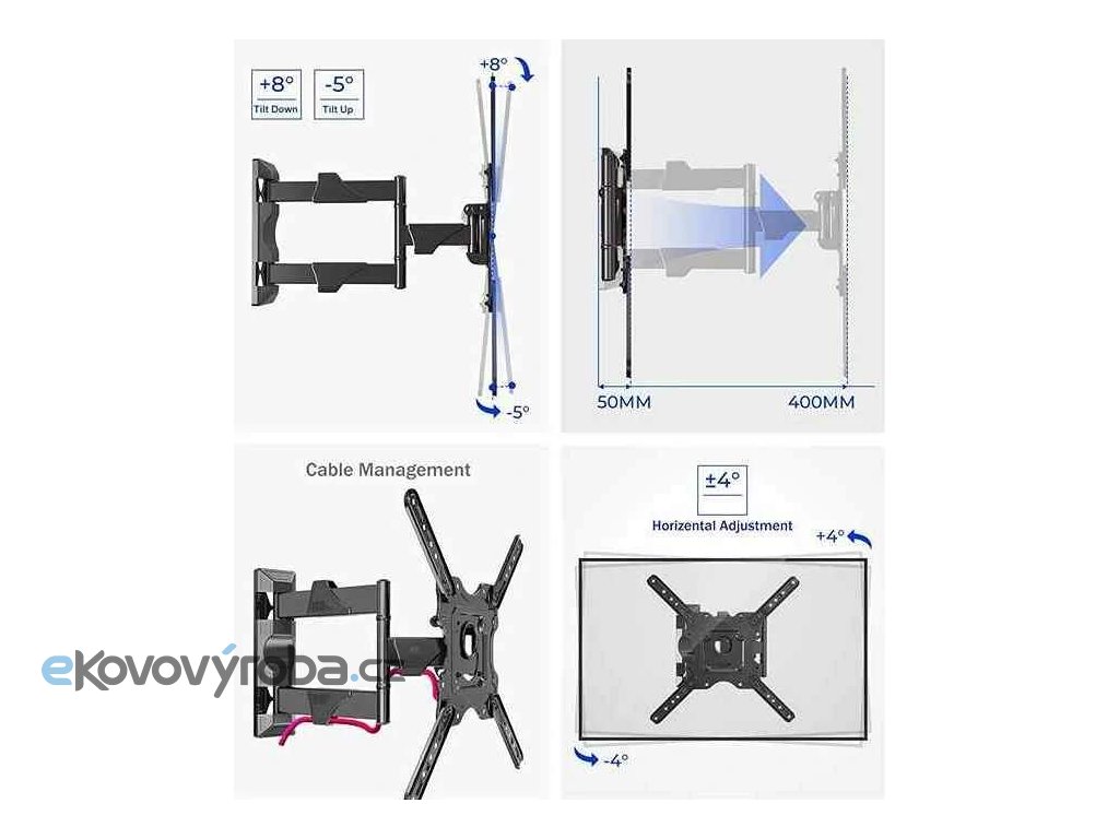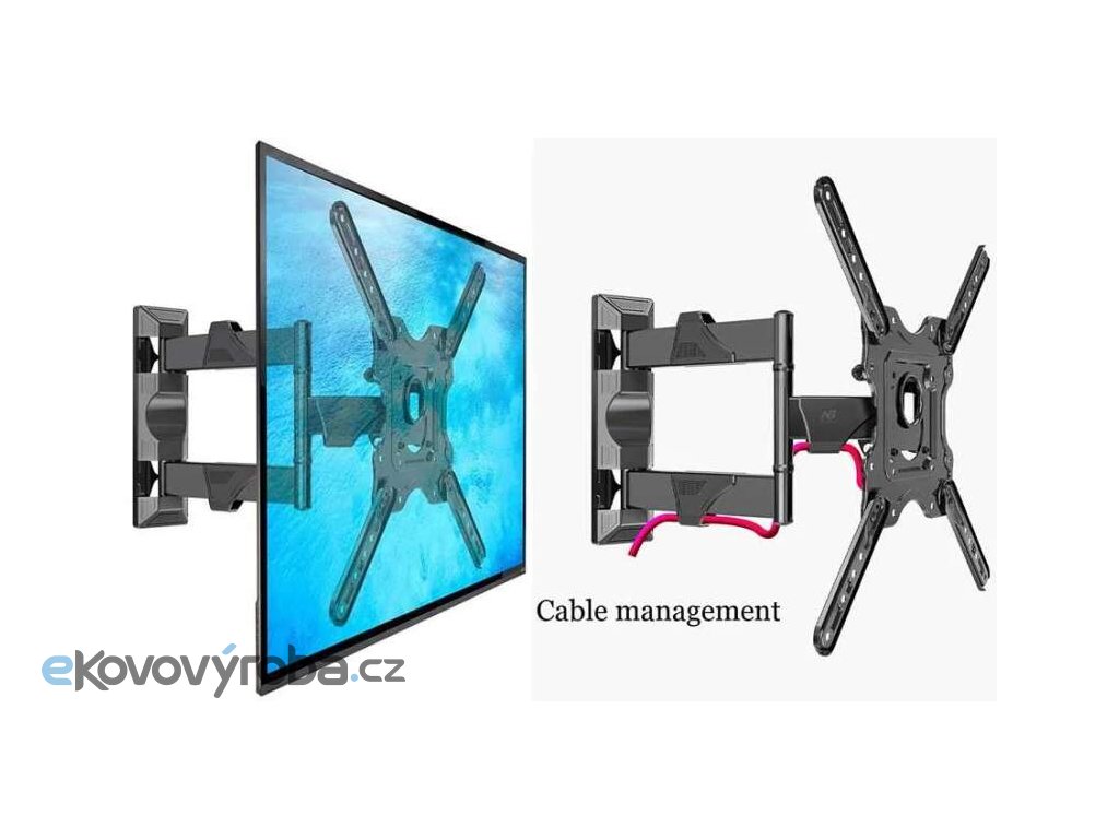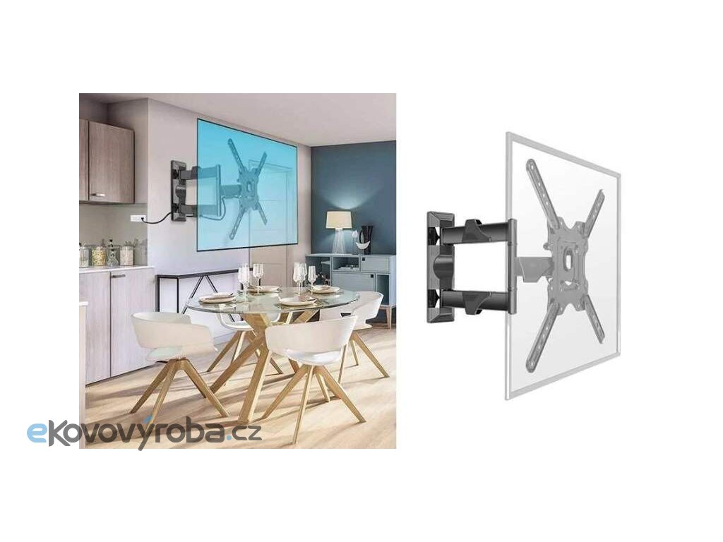 Kvalitní držák pro zavěšení televizí 32" - 55", otočný do stran až +90° / -90°, sklopný +5° / -8°, korekce roviny +4° / -4°, vzdálenost od zdi 50-400 mm, VESA standardy 100x100 až 400x400, úchytky na kabely, instalační materiál, nosnost 27,2 kg, vynikající pevnost