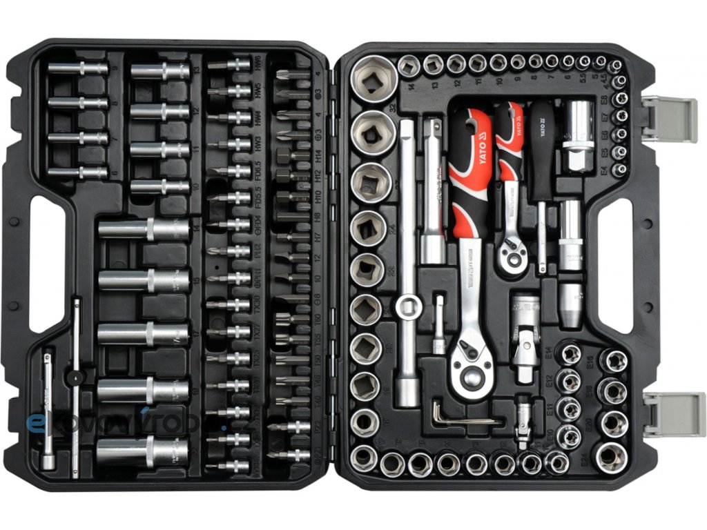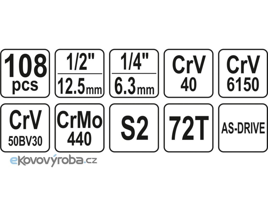 Gola sada 1/2" a 1/4" obsahuje 108ks: nástavců, prodlužovacích nástavců, ráčny s plastovou rukojetí a další příslušenství. Vyrobené z kvalitní oceli CrV40, CrV6150, CrV50BV30, CrMo440 a S2 s funkcí AS-DRIVE. Ráčny mají jemný 72 zubý chod.