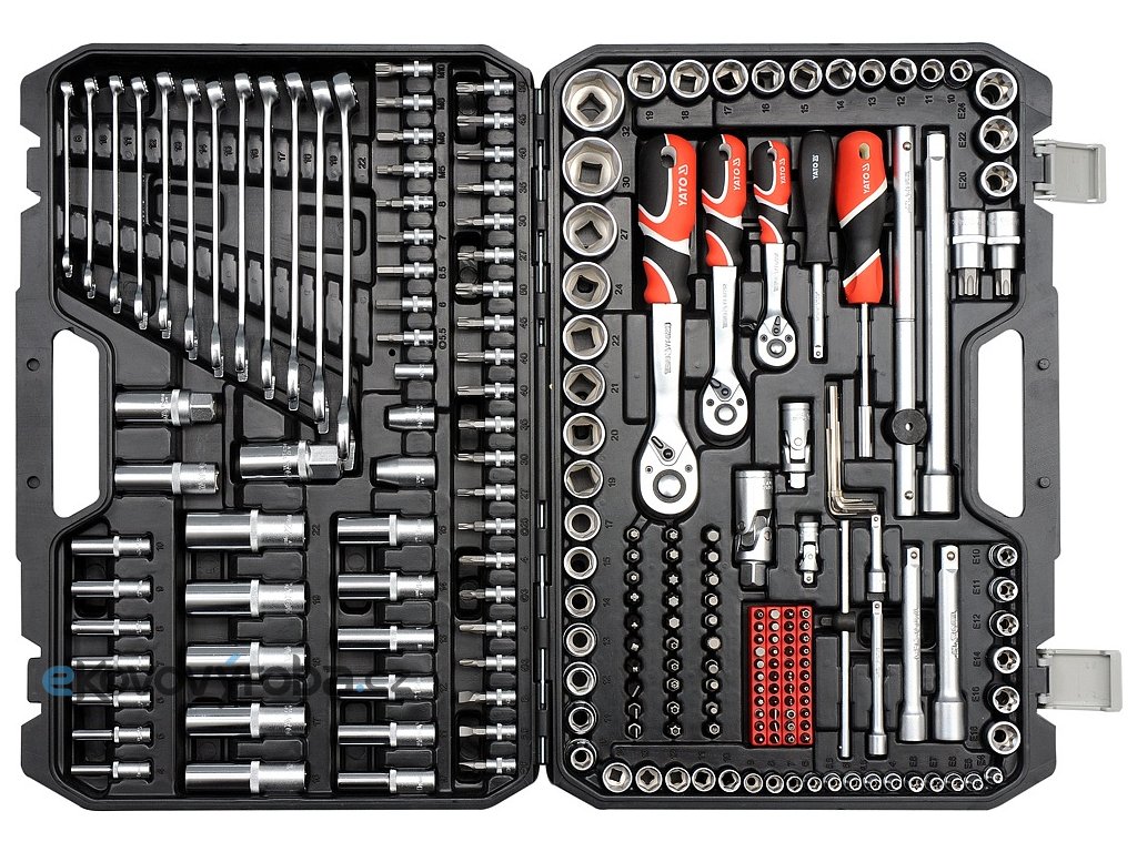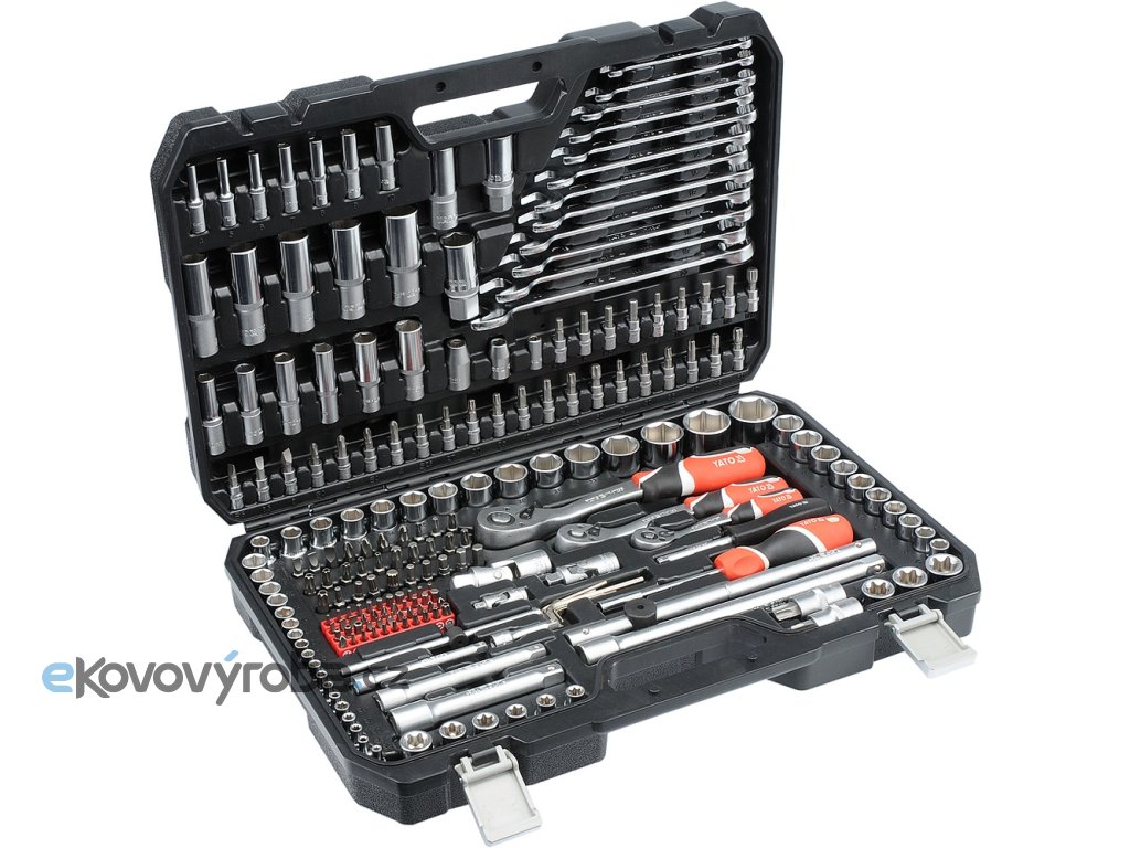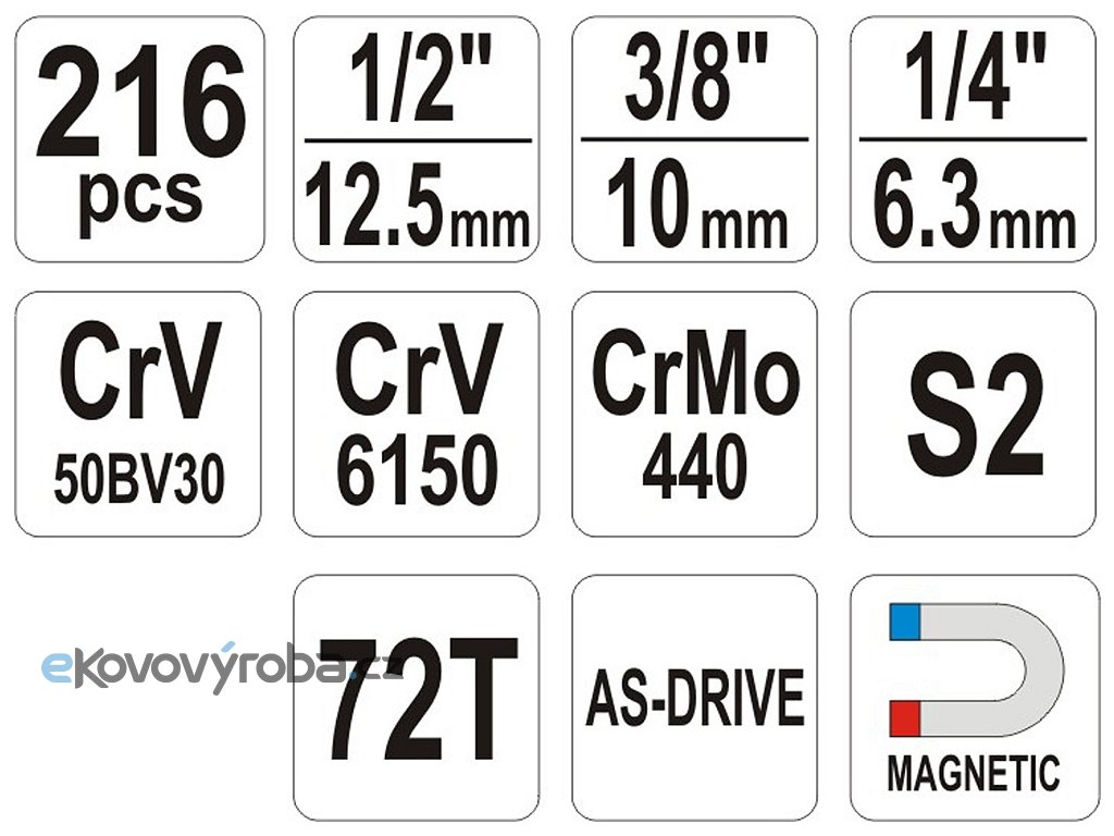 Gola sada 1/2", 3/8", 1/4" obsahuje 216ks: nástavců, prodlužovacích nástavců, ráčny s plastovou rukojetí, kloubové nástavce očkoploché klíče a další příslušenství. Vyrobené z kvalitní chromvanadiové oceli CrV6140 a CrV50BV30, S2 s funkcí AS-DRIVE.