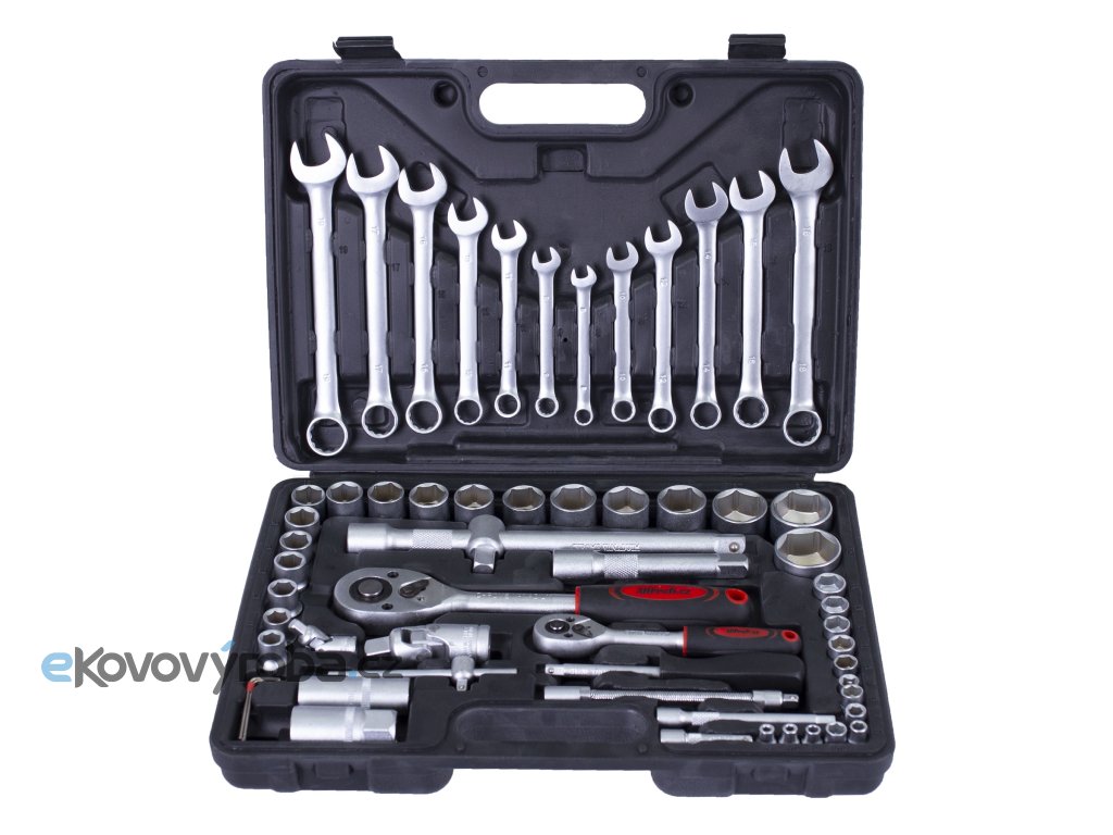 Gola sada složená ze 61 dílů. Sada obsahuje 2 ráčny, ořechy, očkoploché klíče a další díly s nejpoužívanějšími rozměry 1/2" a 1/4". Nářadí je vyrobeno z Cr-V a je uloženo v plastovém kurfu. Celou sadu tak můžete snadno přenést.
