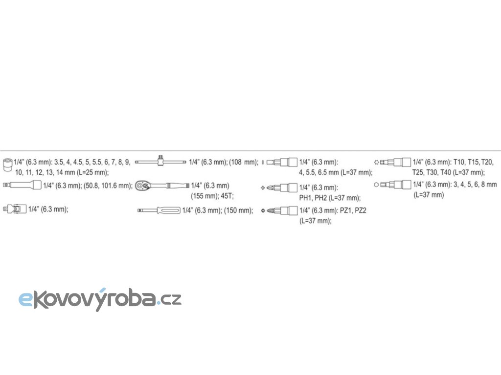 - 14x nástavec 1/4": 3,5; 4; 4,5; 5; 5,5; 6; 7; 8; 9; 10; 11; 12; 13; 14 mm (25 mm)