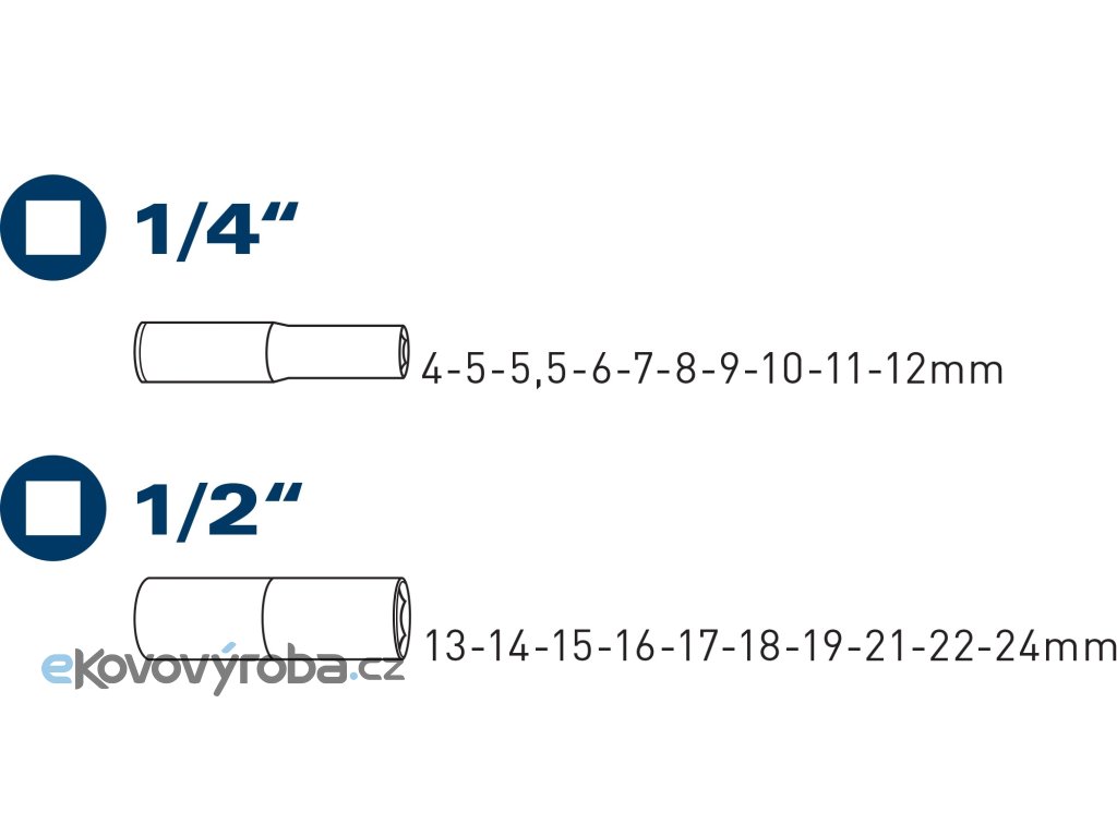 | hlavice nástrčné prodloužené | 1/4": 4-5-5,5-6-7-8-9-10-11-12mm, 1/2": 13-14-15-16-17-18-19-21-22-24mm |