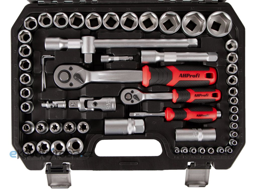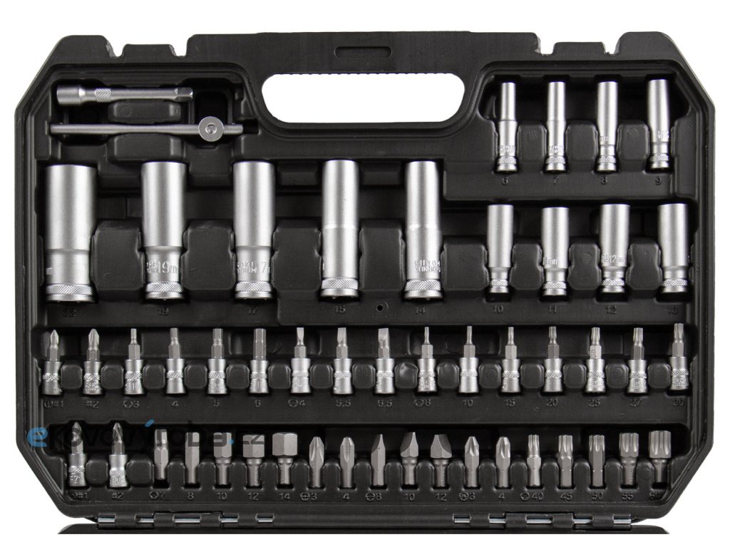 - Komplexní obsah včetně ráčen, nástrčných klíčů, nástavců, bitů aj.