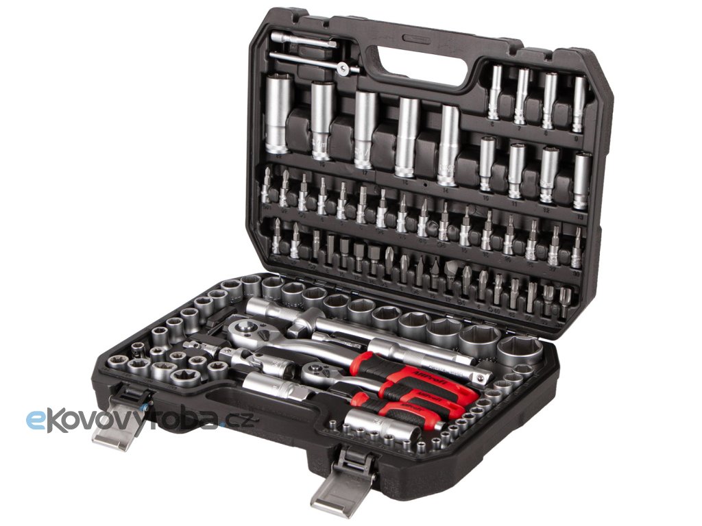 Gola sada 1/2" a 1/4" obsahuje 108 kusů nářadí, jako ráčny, šestihranné nástrčné klíče, nástrčné klíče E-Torx, klíče na svíčky, bity a další. Celá sada je přehledně uložena v pevném plastovém kufříku v rozměru 385 x 280 x 85 mm.