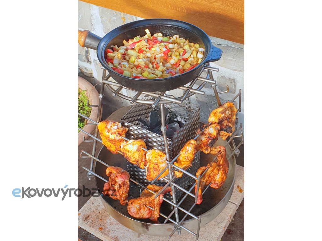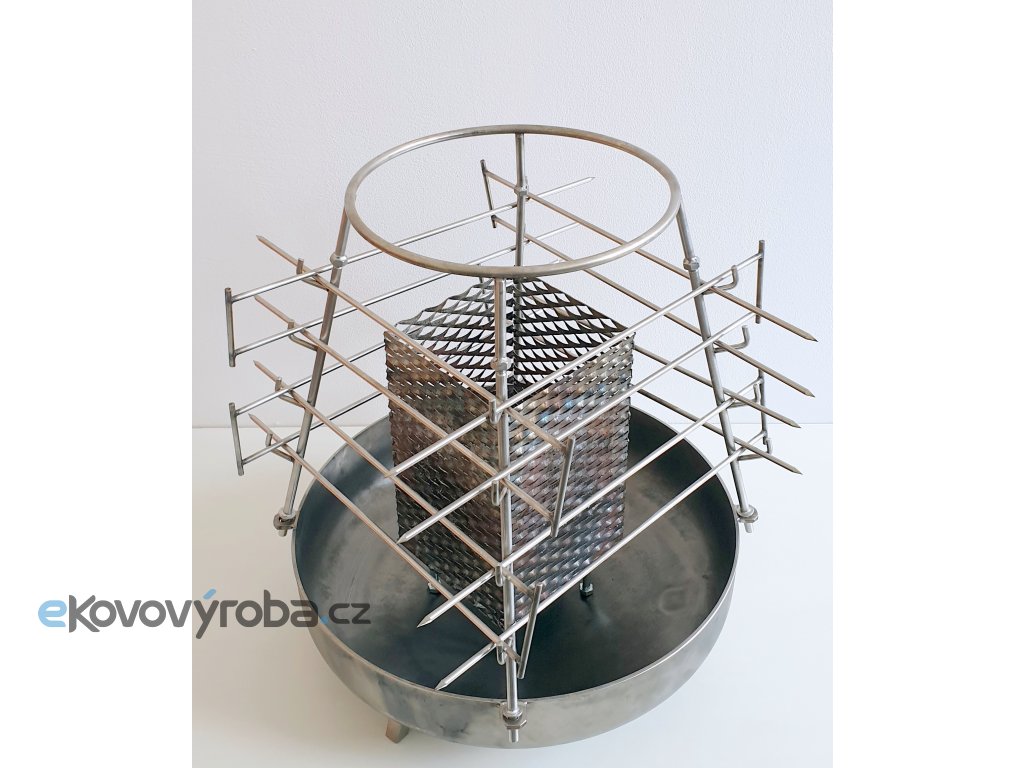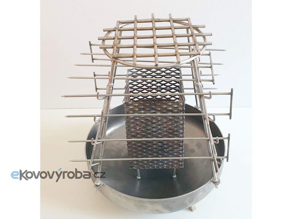 Konstrukce nerezového multifunkčního grilu o průměru 40cm je řešena tak, že grilování může probíhat ze všech čtyř stran současně a zároveň je možné na horní ploše grilu, za použití pánve nebo jen mřížky, připravovat další pokrmy. Po odstranění horní mřížky lze na gril použít i pánev WOK. Gril je po obvodě vybaven devíti špízy o ploše 0,25m2 a jeho topeniště je volně v jeho středu. Tato konstrukce umožňuje postavit gril na stůl aniž by hřál směrem dolů a každý účastník grilování si může obsluhovat svoji stranu, na které má dva špízy.