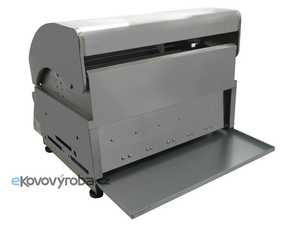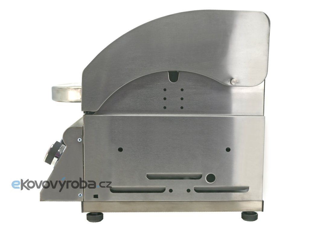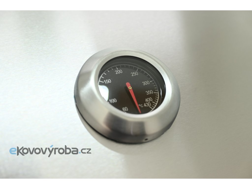 Konstrukce z nerezové oceli dodá grilu brilantní vzhled a vysokou odolnost. Vyklápěcí víko je opatřeno teploměrem a mohutným madlem pro snadnou manipulaci. Pro snadnou údržbu je zadní strana grilu opatřena poličkou po celé ploše grilu, určenou pro zachytávání odkapávajícího tuku. Na spodní straně je gril doplněn nožičkami s nastavitelnou výškou, pro vyrovnání grilu.