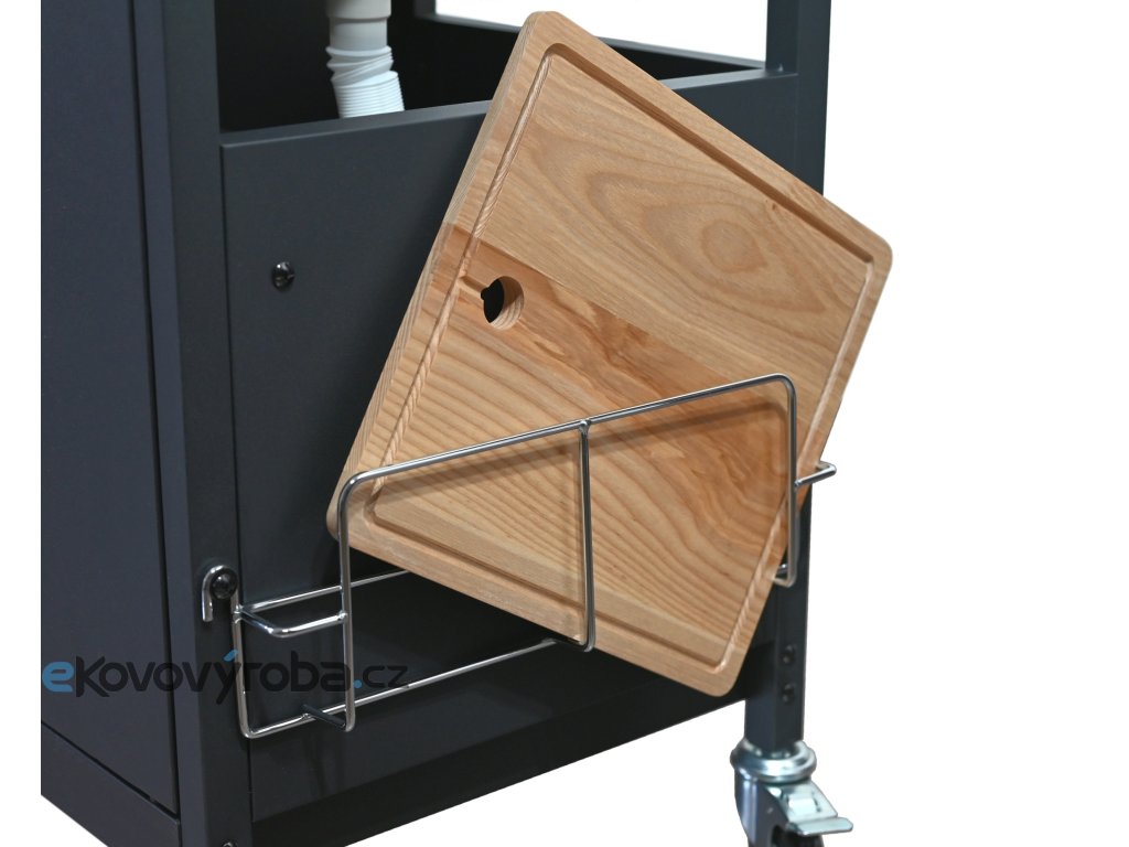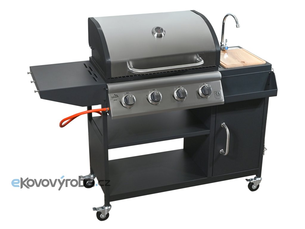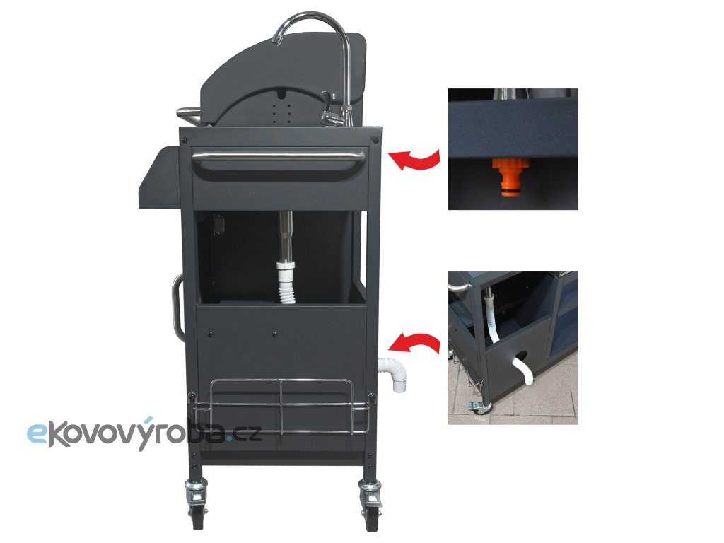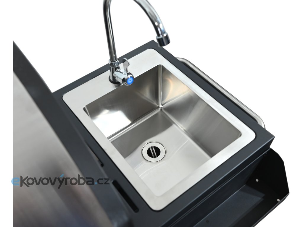 Dřez spolu s vodovodním kohoutkem je výborným pomocníkem při grilování. Vodovodní baterie je zakončena šroubením, na které lze připojit rychlospojku pro zahradní hadici a tím baterii snado připojit k vodě. Dřezová výpusť je ze spodní strany opatřena vývodem pro odtok vody z dřezu, vývod je možné směřovat např. do kbelíku, nebo ji lze vhodným způsobem připojit k běžnému odpadu.