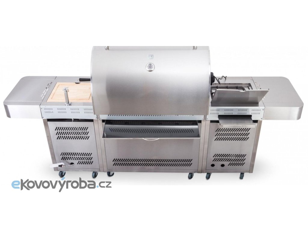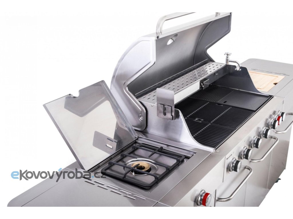 Vše na jednom místě – můžete zároveň grilovat, na bočním hořáku dusit přílohovou zeleninu a použité nádobí hned oplachovat ve vestavném dřezu, bez nutnosti přenášet grilovací vybavení neustále do domu a zpět.