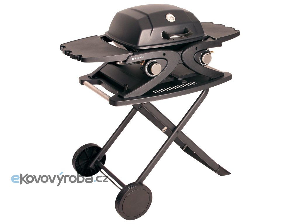 pojízdný stolek se dá lehce složit, má velká pojezdová kola, dvě velká madla a systém pro snadné připojení grilu, se kterým pak tvoří velmi stabilní sestavu