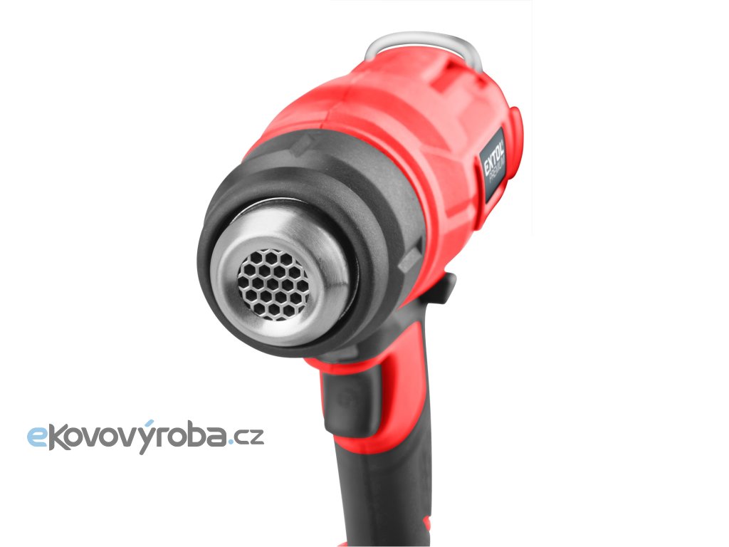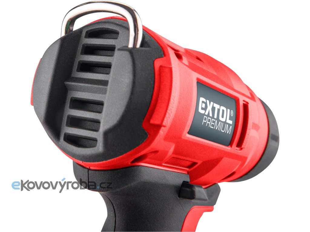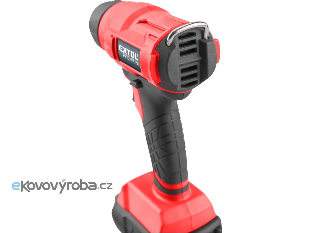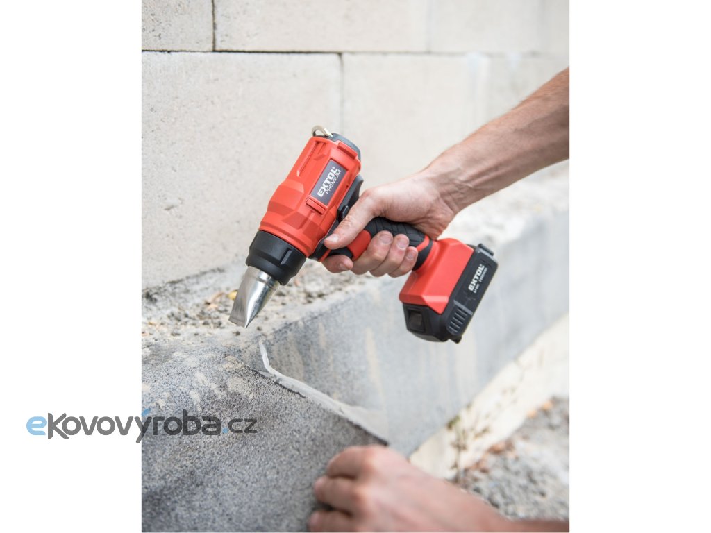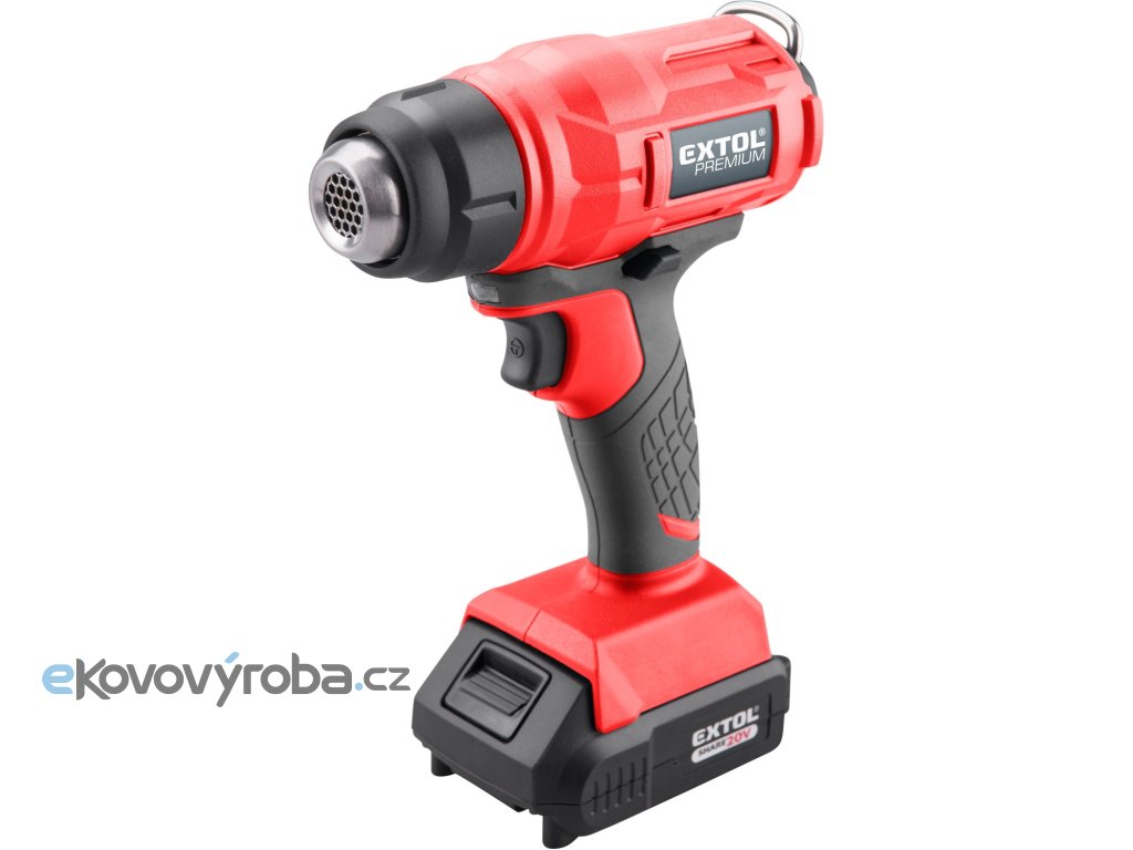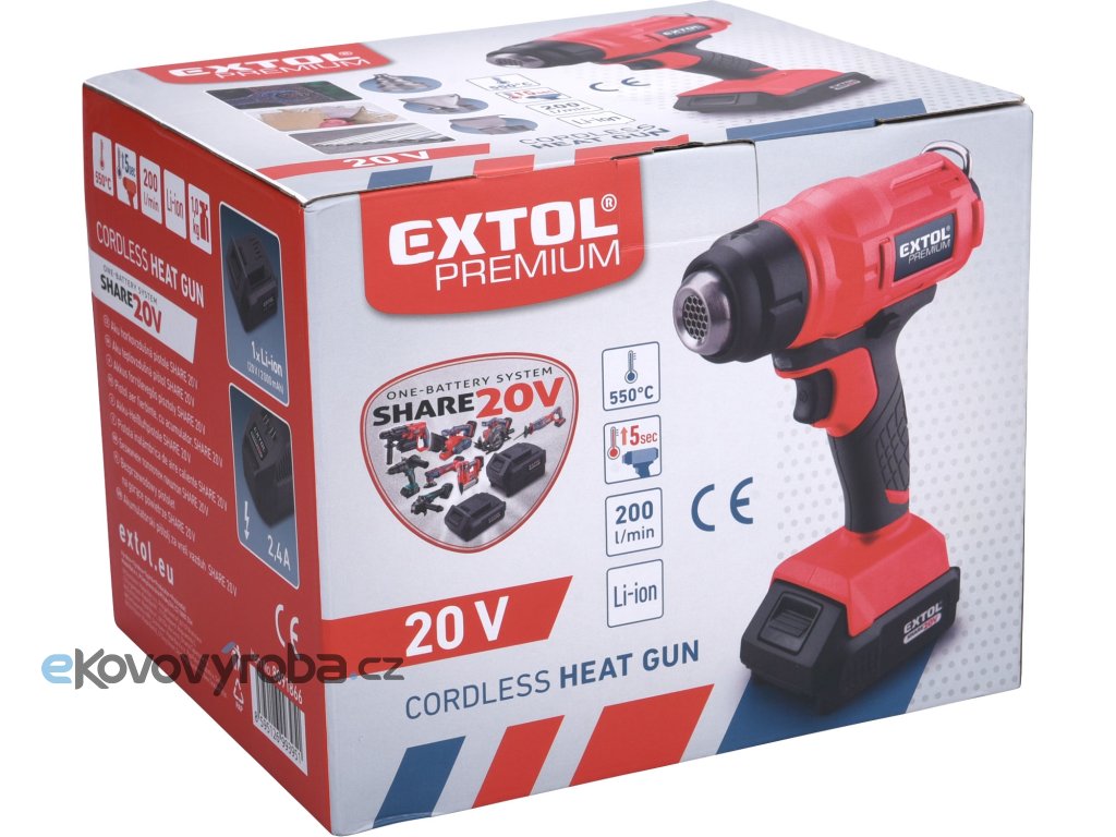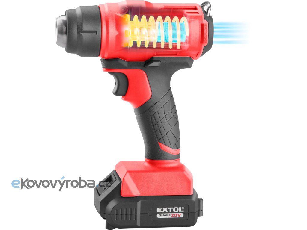 Aku horkovzdušná pistole s teplotou vzduchu až 550°C je určena k tvarování, smršťování a spojování umělých hmot, k ohýbání plastových trubek, k uvolňování lepených spojů, dále k rozmrazování zamrzlého potrubí, k odstranění mechu a plevelů ve spárách dlažby, k zapalování grilovacího uhlí, sušení atd. V malém rozsahu lze použít také na odstraňování starých barev a laků. Pistole se nahřeje na provozní teplotu za 5 vteřin od zapnutí díky elektronickému řízení nahřívání. Pro zvýšení životnosti stroje, ventilátor pracuje ještě několik vteřin po uvolnění spínače, aby ochladil topnou spirálu. Pistole je vybaven LED svítilnou, která osvětluje pracovní prostor při práci a háčkem na zavěšení. Součástí dodávky jsou tři vyměnitelné trysky – redukční tryska (úzký proud vzduchu): pro koncentrování proudu vzduchu (tepla) do malého místa, např. pro pájení či ohýbání plexiskla, široká tryska: pro nahřívání širší plochy, trubková tryska: pro nahřívání trubek. Díky integrovanému snímacímu prstenci lze z pistole rychle sejmout horkou koncovku a vyměnit ji za jinou bez vyčkávání na zchladnutí nebo bez použití kleští. Pro běžnou práci dostačují jeden nebo dva 2000mAh akumulátory, které můžete rychle nabít v rychlonabíječce, pro náročnější nebo delší práci doporučujeme větší akumulátory s kapacitou 4000–8000mAh. Akumulátor lze použít ve všech typech nářadí řady EXTOL SHARE20V. Díky použité Li-ion technologii je ho možné kdykoliv dobíjet, aniž by se tím snižovala jeho kapacita. Li-ion akumulátor ztrácí energii vlivem samovybíjení velmi pomalu a vydrží dlouho nabitý a připravený k použití.