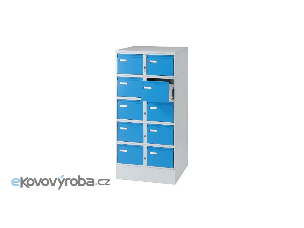 Vyrobeno z kvalitního ocelového plechu. Povrchová úprava provedena práškovou barvou. Uzamykání každého páru zásuvek samostatným zámkem. Stejný klíč pro všechny zámky v sestavě.
