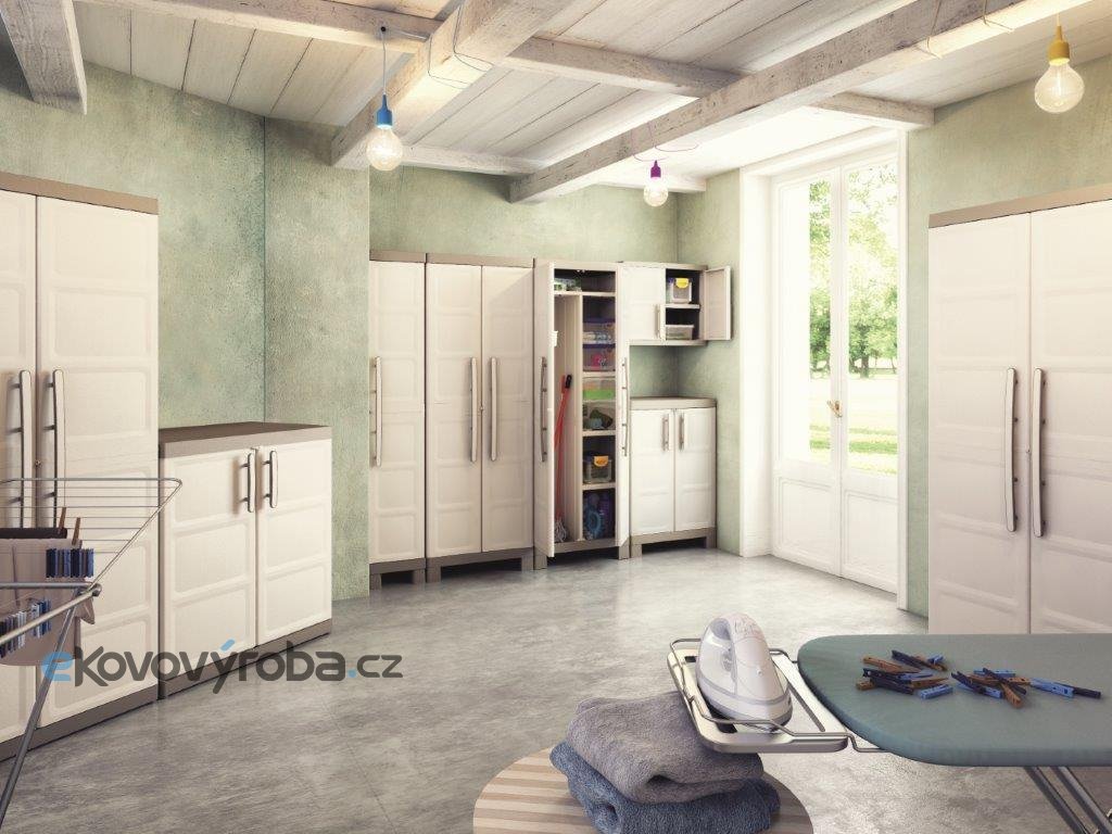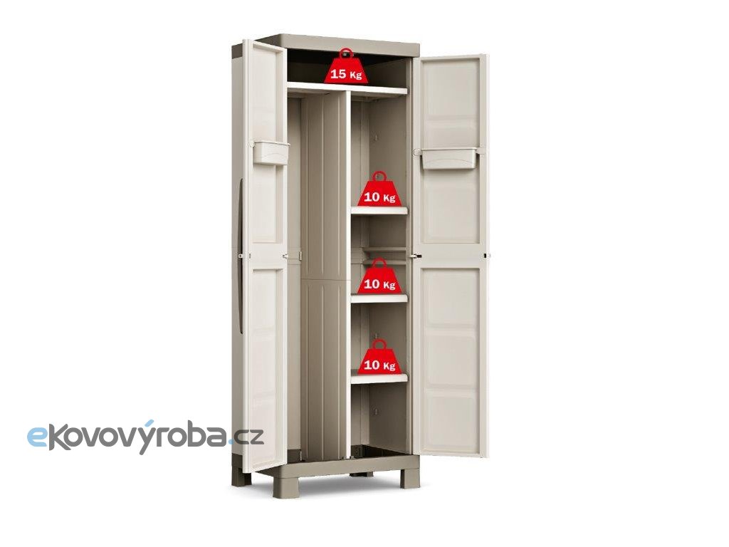 Skříň obsahuje celkem 3 přídavné police - každá s výraznou nosností až 10 kg, které přijdou vhod pro výrazně těžší předměty všeho druhu. Lze ji tedy využít pro skladování dílenského nářadí či zahradnických potřeb, kdy přijde vhod pro uložení náčiní s dlouhou násadou, které by se jinam nevešlo. Díky svému provedení v univerzální béžové barvě zapadne do každého prostoru bez ohledu na jeho konceptuální styl.