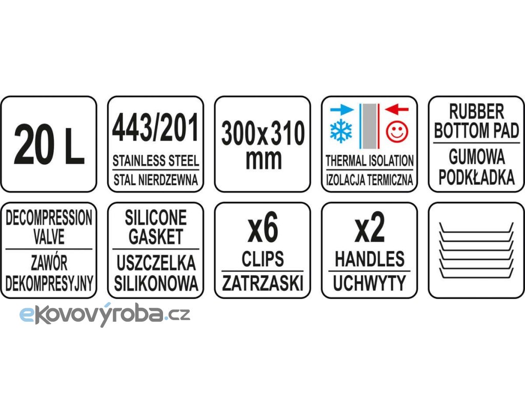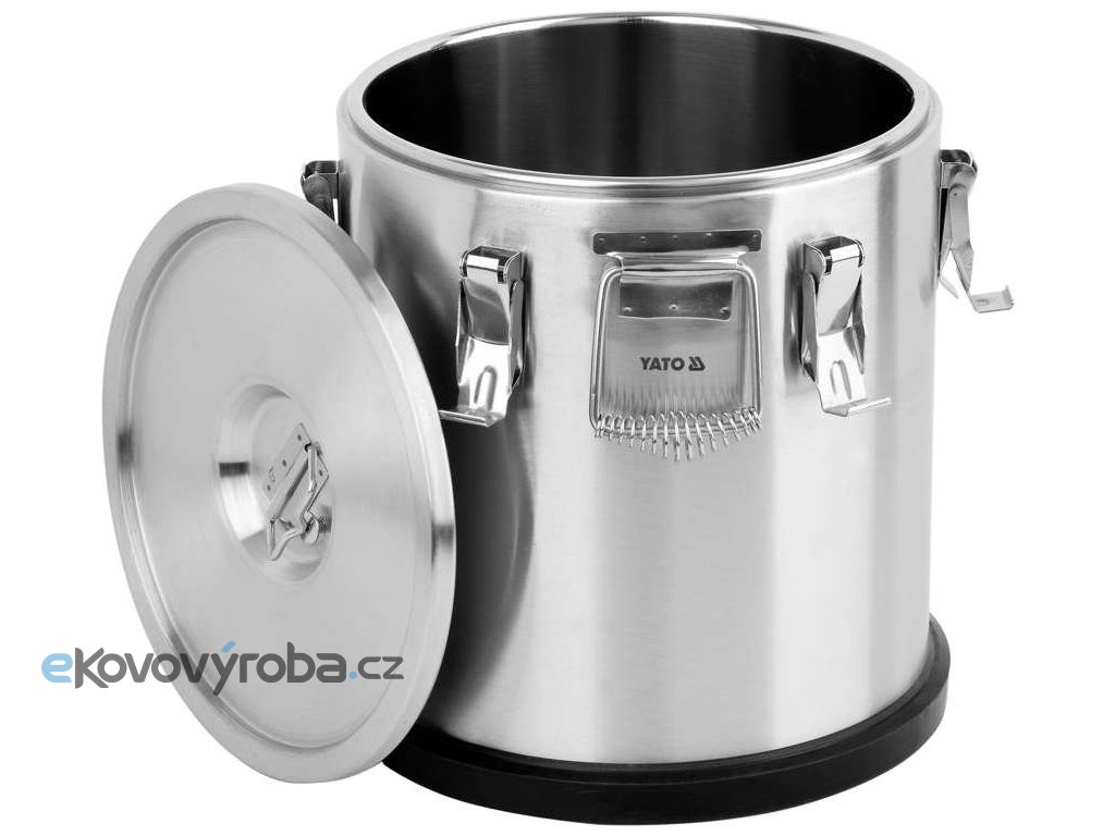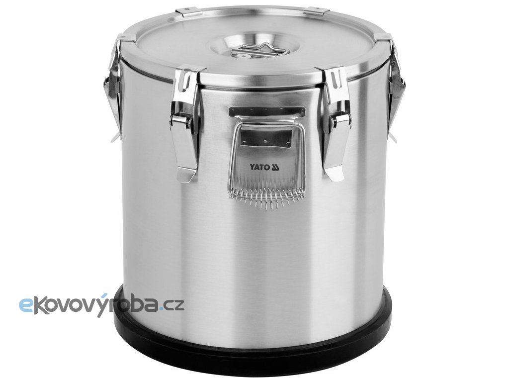 Termos je vybaven dvěmi masivními držadly z nerezové oceli pro snadný transport a šesti zápatkami uzavírající víko. Vysoká kvalita a odolnost těchto prvků zaručuje mnoho let bezproblémového používání. Dno termosu YATO je chráněno gumovým krytem, který zabraňuje sklouznutí po zemi během přepravy.