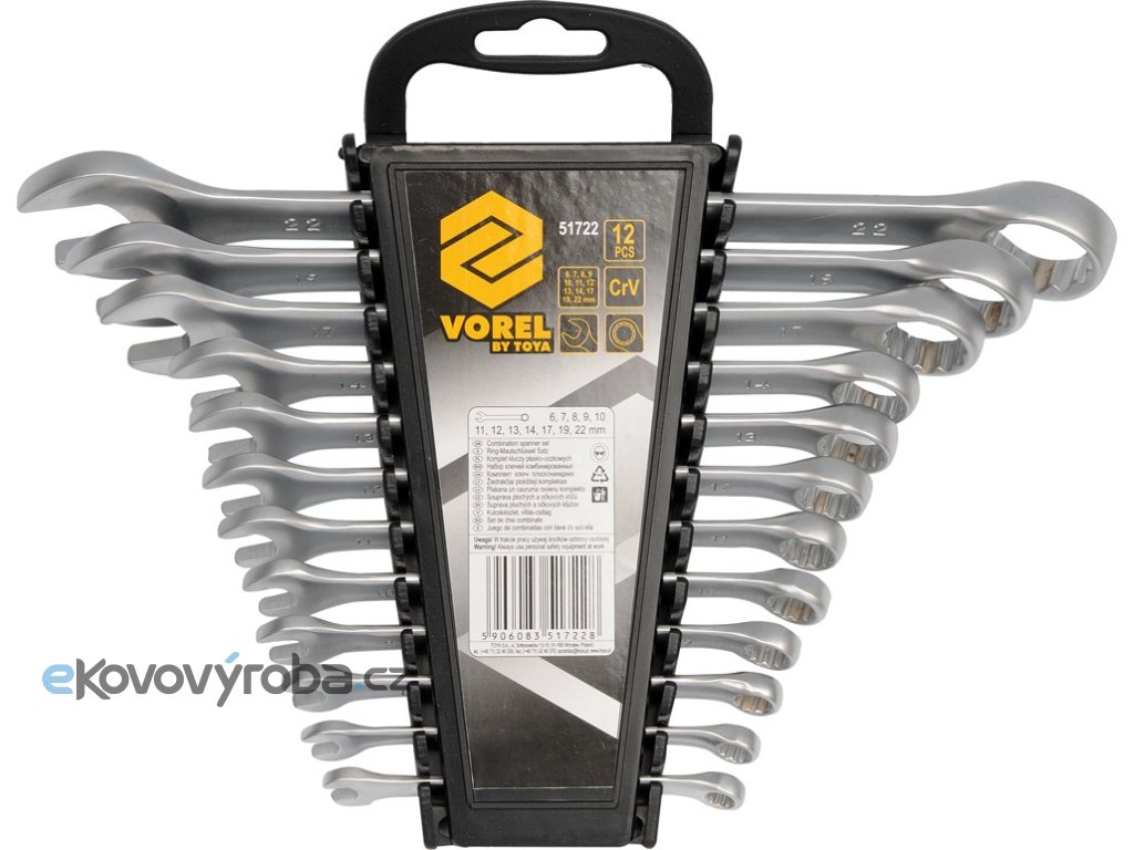 Sada klíčů očkoplochých 12 ks 6 - 22 mm vyrobené z kvalitní CrV oceli, uložené v přehledném plastovém pouzdře.