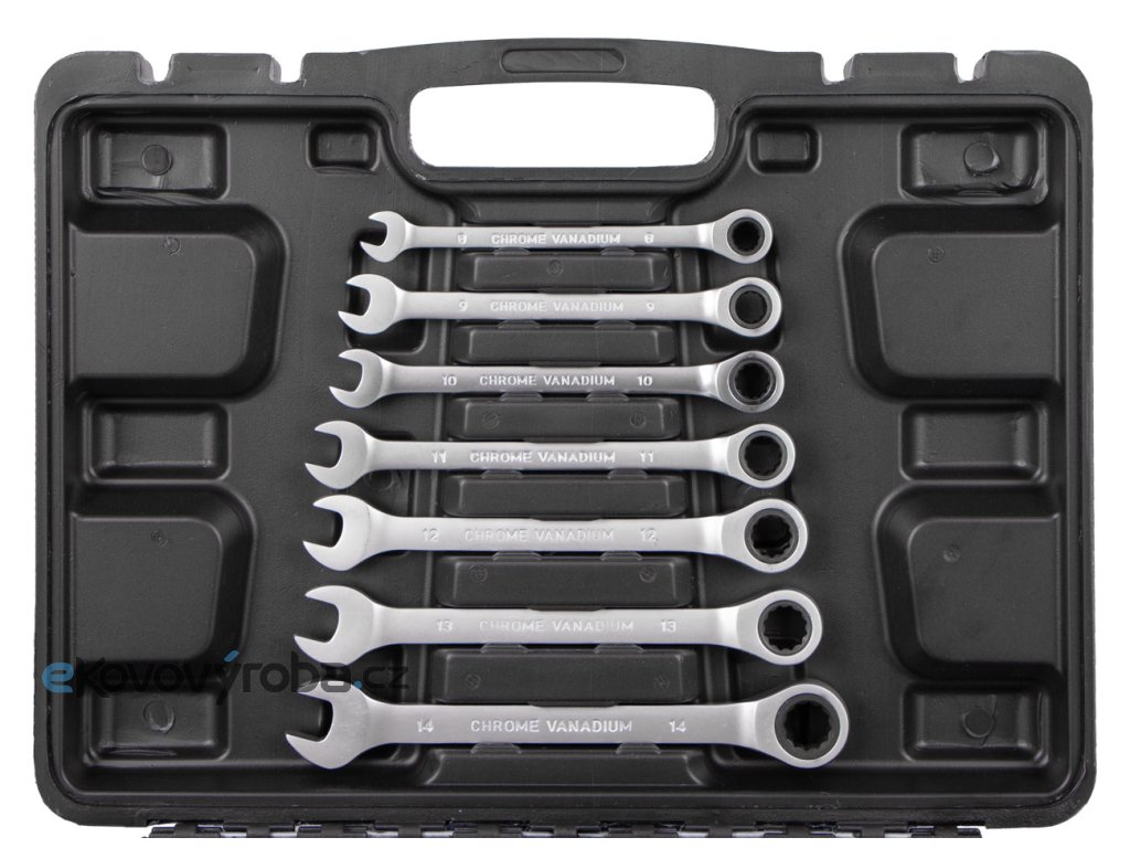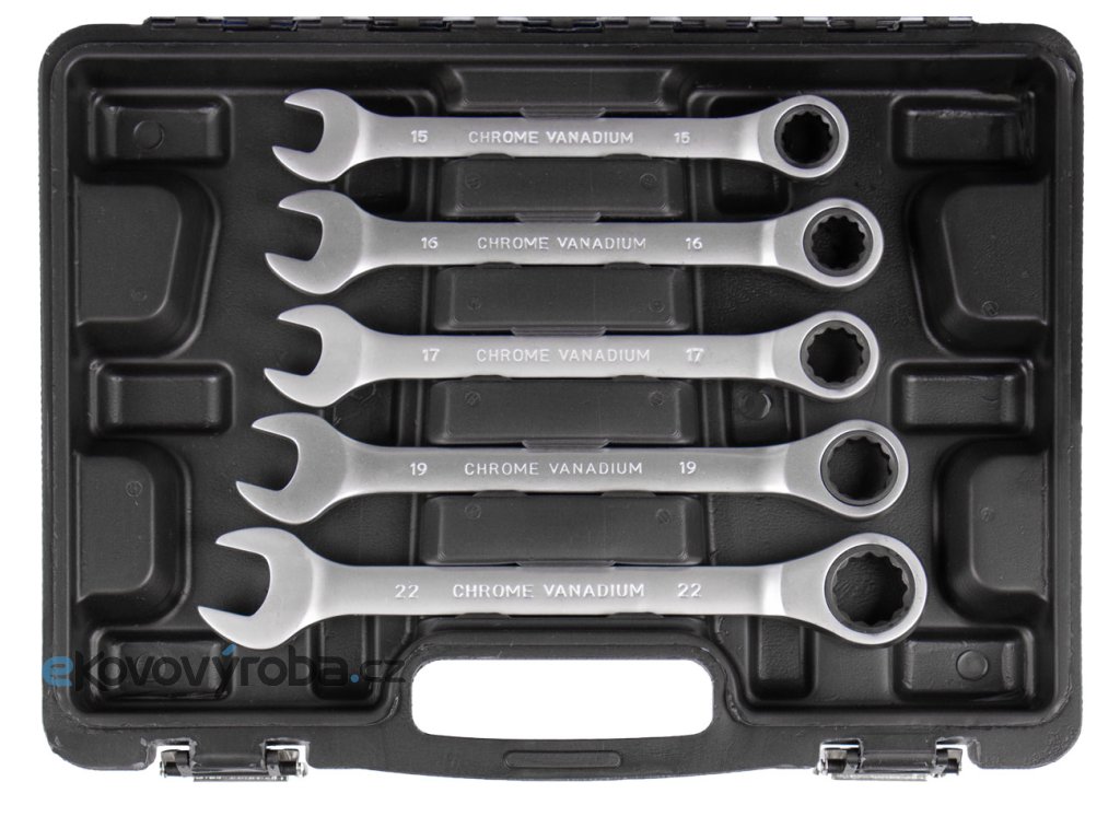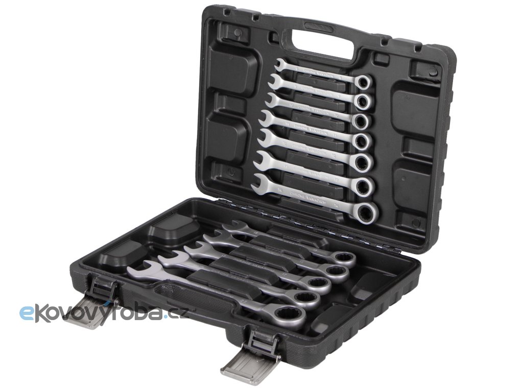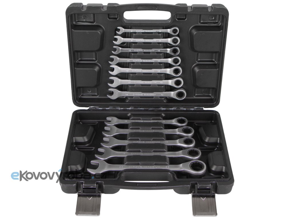 - Sada 12 ks očkoplochých ráčnových klíčů o velikosti 8, 9, 10, 11, 12, 13, 14, 15, 16, 17, 19 a 22 mm.