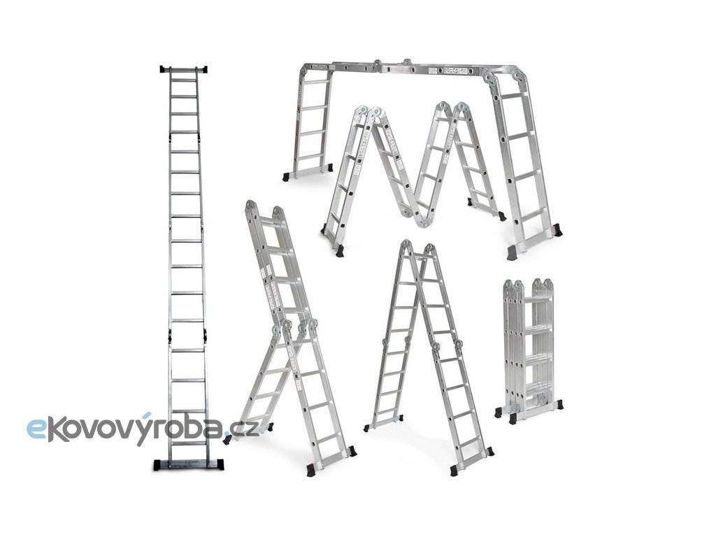 Unikátní řešení kloubového žebříku umožní získání více možností použití. Dostatečně tuhá konstrukce je z lehkého hliníku. Má minimální úložnou velikost vejde se do zavazadlového prostoru osobního vozidla. Je možné ho použít jako štafle, příložný žebřík nebo jako malé lešení s možností dokoupení pracovní plošiny nebo police. Při práci na lešení je max. pracovní výška 4x3-3m,4x4-3.29m, při práci na rozložených štaflích 4x3-3.35m, 4x4-3.87m a při práci na rozloženém žebříku 4x3-4.8m,4x4-5.85m. Rozměr plošiny - 4x3 - 90x31cm a 60x31cm, 4x4 - 115x29,5 a 87x29,5 cm