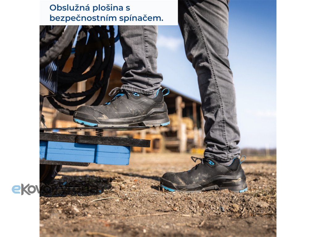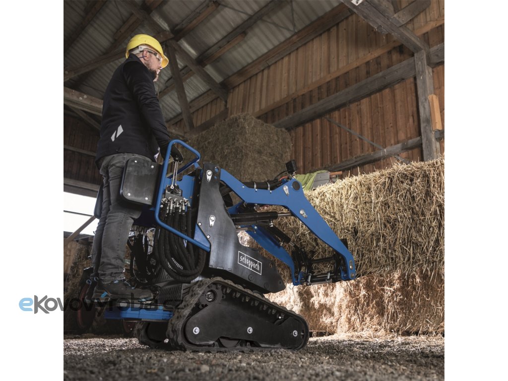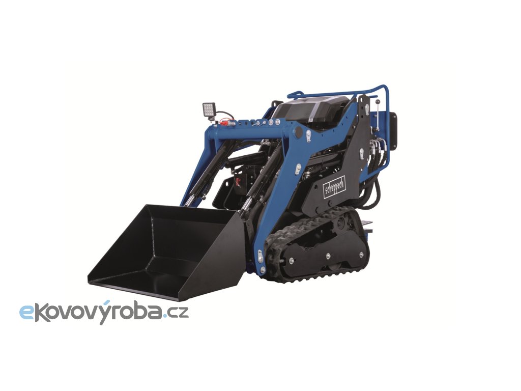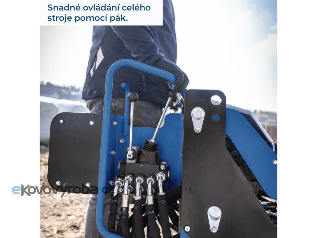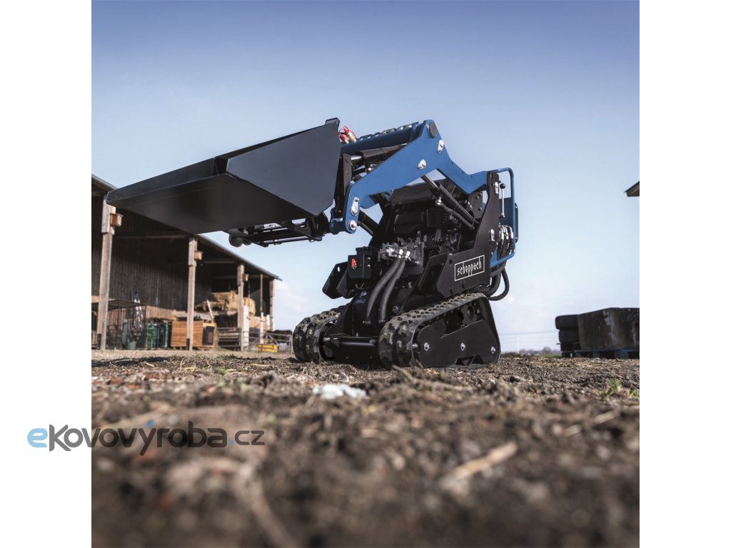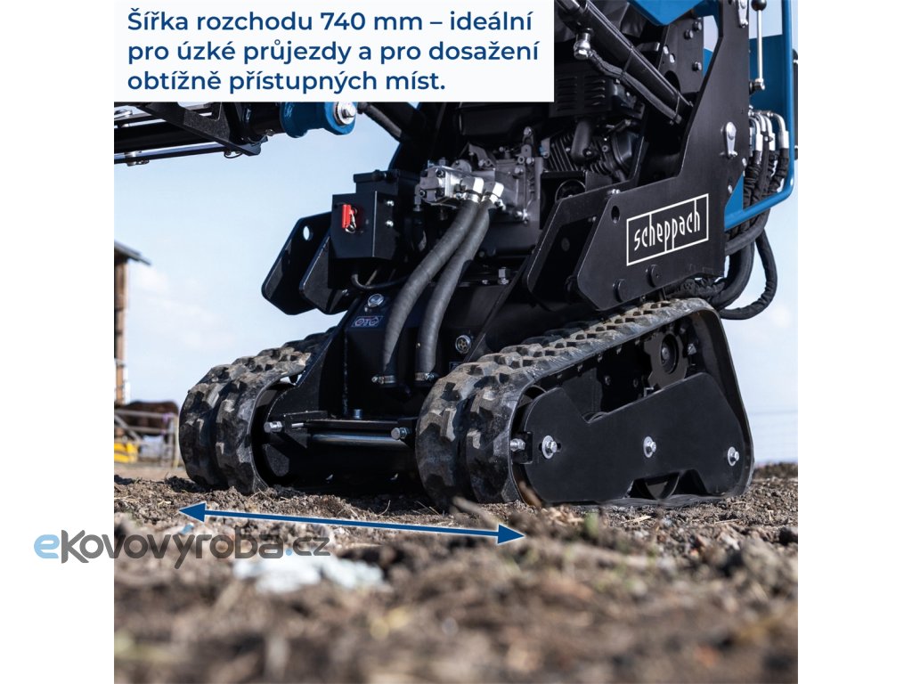 S šířkou pouhých 740 mm se snadno dostane i do úzkých průchodů a hůře přístupných míst, kde by jiné stroje selhaly. Díky výkonnému čtyřtaktnímu benzínovému motoru o výkonu 8,5 HP (306 cm3) zvládá i náročnější práci s lehkostí a spolehlivostí. Pásový podvozek s možností samostatného ovládání každého pásu a šířkou 180 mm zajišťuje maximální stabilitu i v nerovném terénu. Nakladač si poradí se stoupáním až 25° a díky nízkému tlaku na podklad (32 kPa) se pohybuje šetrně i po měkkém povrchu. Obsluha je jednoduchá a bezpečná – ergonomická plošina s bezpečnostním spínačem a boční zábranou poskytuje komfort i ochranu při práci. Nakladač je vybaven hydraulickým rychloupínáním, takže výměna nástavců je otázkou okamžiku.