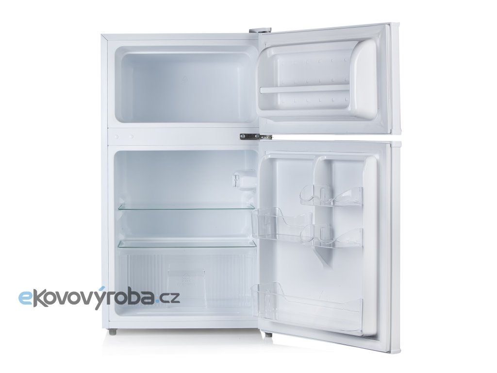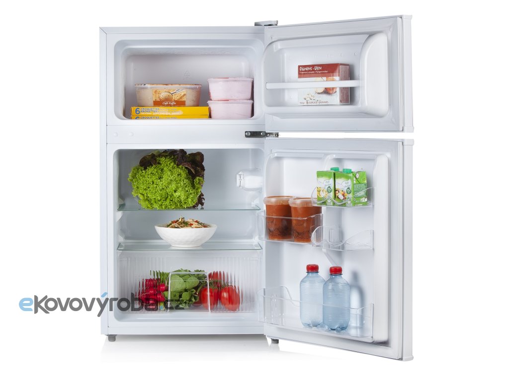Menší lednice v bílé barvě s vnitřním prostorem rozděleným na 61 litrů clhadící zóny a 26 litrů mrazáku. Takové provedení je ideálnní pro studenty, pokojů pro hosty a všude tam kde není potřeba velké lednice a mrazáku. Svou výškou 85 cm se lednice pohodlně vejde do většiny kuchyní i jako částečná vestavba. Vnitřní prostor lednice je rozdělený skleněnou policí, kterou lze vyjmout a ve dveřích lednice jsou 4 transparentní přihrádky na nápoje a růzmé menší potraviny apod. Všechny přihrádky ve dveřích lze vyjmout a změnit tak vnitřní uspořádání dle potřeby. Možnost lepšího uspořádání potravin v mrazáku pak napomáhá přihrádka ve dvířkách mrazáku do které lze umístit například krabičku s potravinami o velikosti až 31x5x14 cm.
